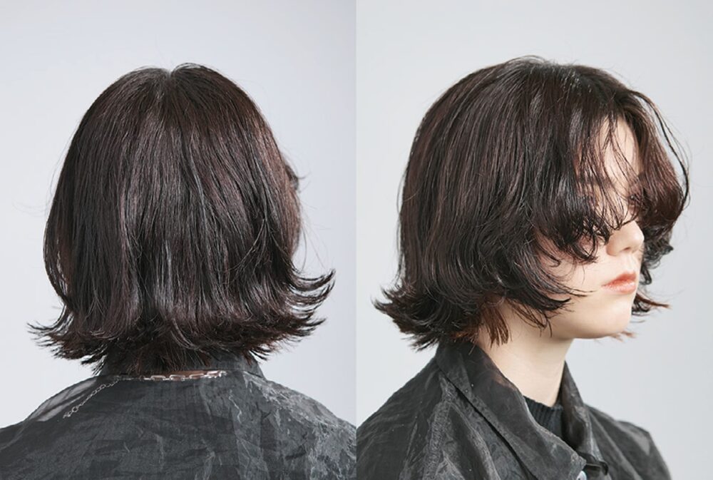 ウルフと聞くと派手なイメージを持ちがちだが、旬のウルフはアレンジしたときでも丸みが出るようバックに丸みを残し、顔まわりで遊ぶデザインなので、若い方から大人の方まで幅広く楽しめる。巻かなくてもハネるので、スタイリングがしやすいのも人気の理由。