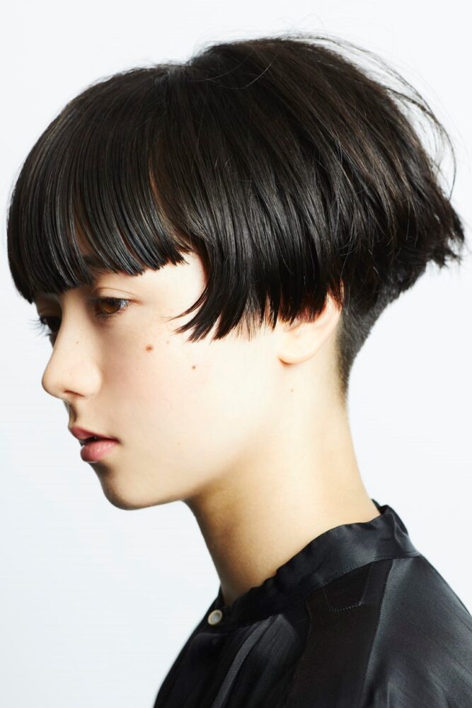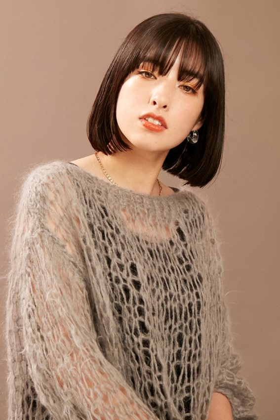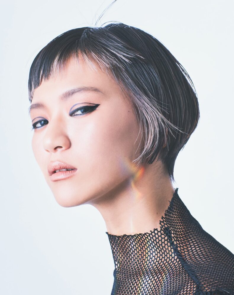 段差のように、パツっと切り込んだステップバングは、モードだけどどこかエモい、新鮮さが光る。顔まわりの前下がりラインでシェーディング効果も。ブラント感のあるアウトラインがボブに鮮度を与える。