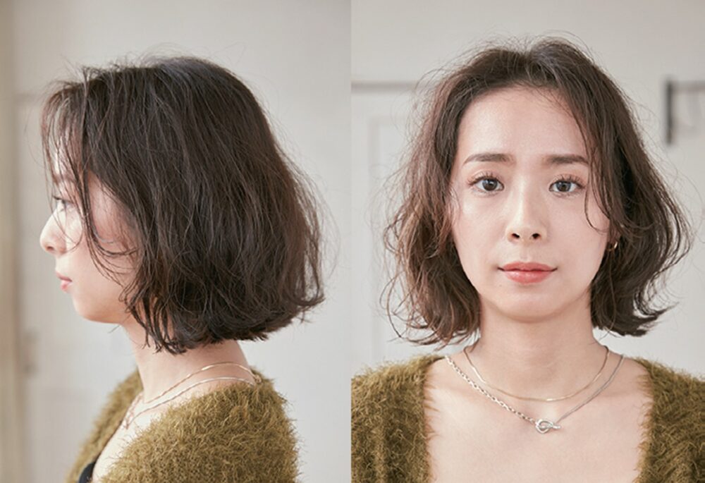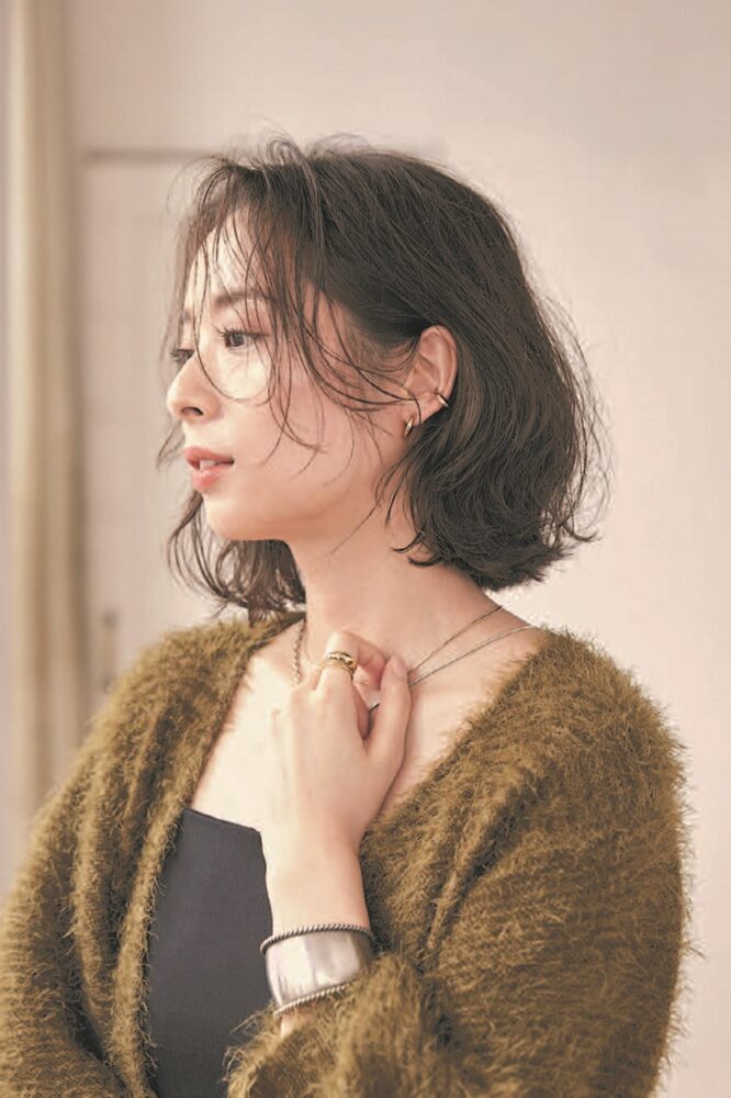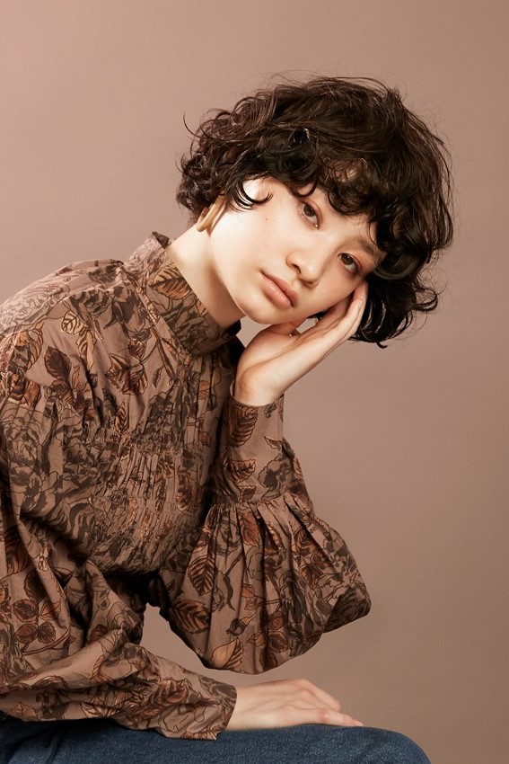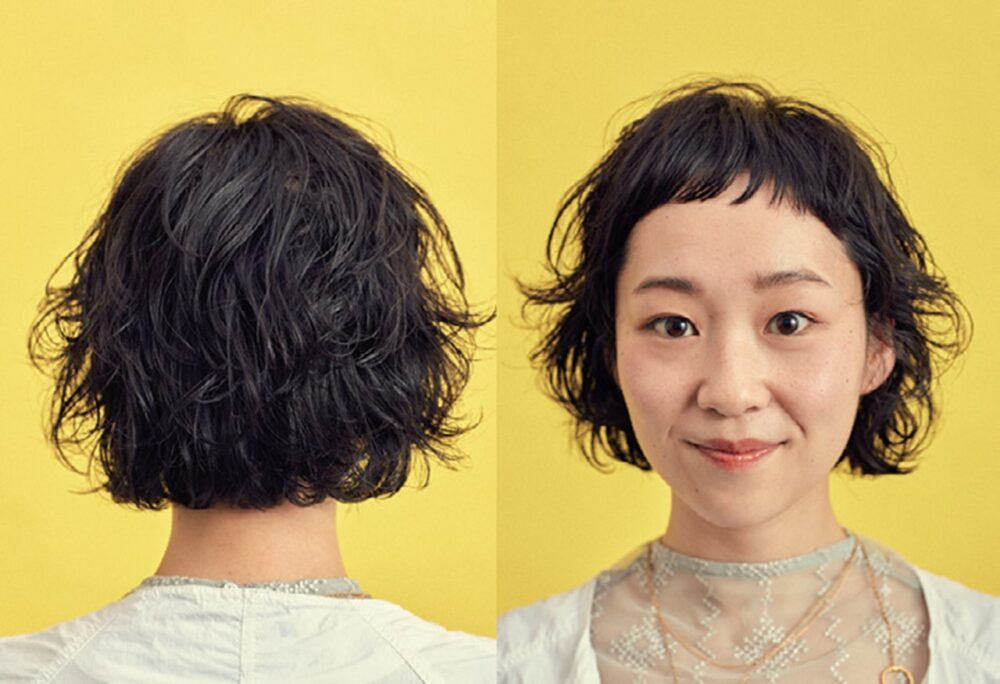 切りっぱなしボブを楽しんだら次は毛先がカールする程度のニュアンスパーマをプラス。隙間間のある束感をつくることで、コンパクトなシルエットはそのままに柔らかさと甘さがアップする。