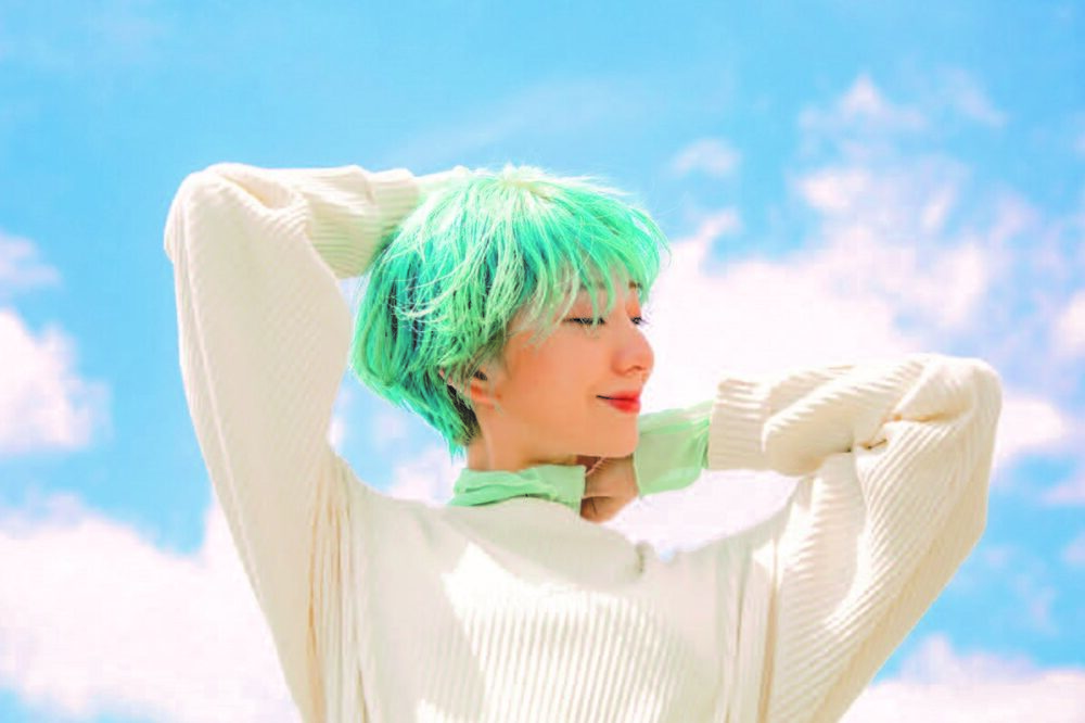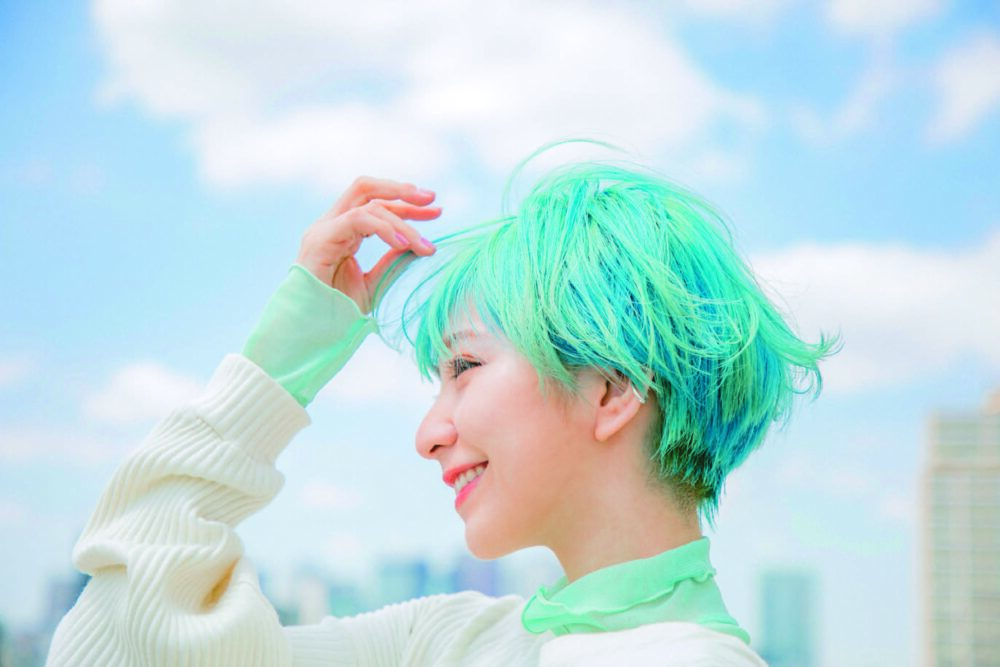高彩度のミントブルーと動きのあるカールで、「昼」の青空に映える鮮やかな色が主役のショートボブで軽やかに。メイクは暖色でカジュアル感を出すと完璧!