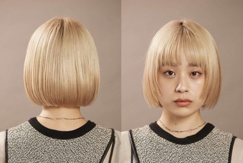 ブリーチでハイトーンなクリアブロンドを切りっぱなし風のボブにON。顔まわりに動きや毛束感があるので、重くなりすぎずこなれた印象に。スリークな質感にすれば落ち着いた雰囲気も楽しめる。