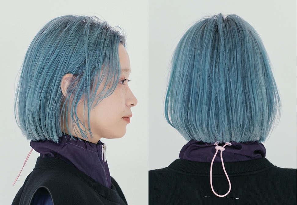 インディゴ単品で表現するパキッとブルーはハードル高め。かといって水色だとありきたりなので、イエローをミックスすることで少し緑みを感じさせるターコイズを狙って。ブルーだと肌がくすみがちだが、ターコイズは日本人の肌になじむので、挑戦しやすい。根元~毛先まできれいなワントーンカラーは、ストレートで仕上がりの美しさを楽しもう。