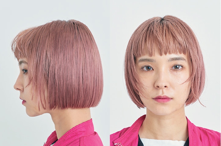 重厚感のあるボブも、顔まわりの“フェイスレイヤー”で、旬な重軽バランスに。ディスコネで切り込んだ顔まわりとワイドバングは、ほどよく肌見せしてくれるので、マスク姿でも明るい印象に。鮮やかなピンクコーデには、ペールトーンのピンクカラーを合わせて大人っぽく。