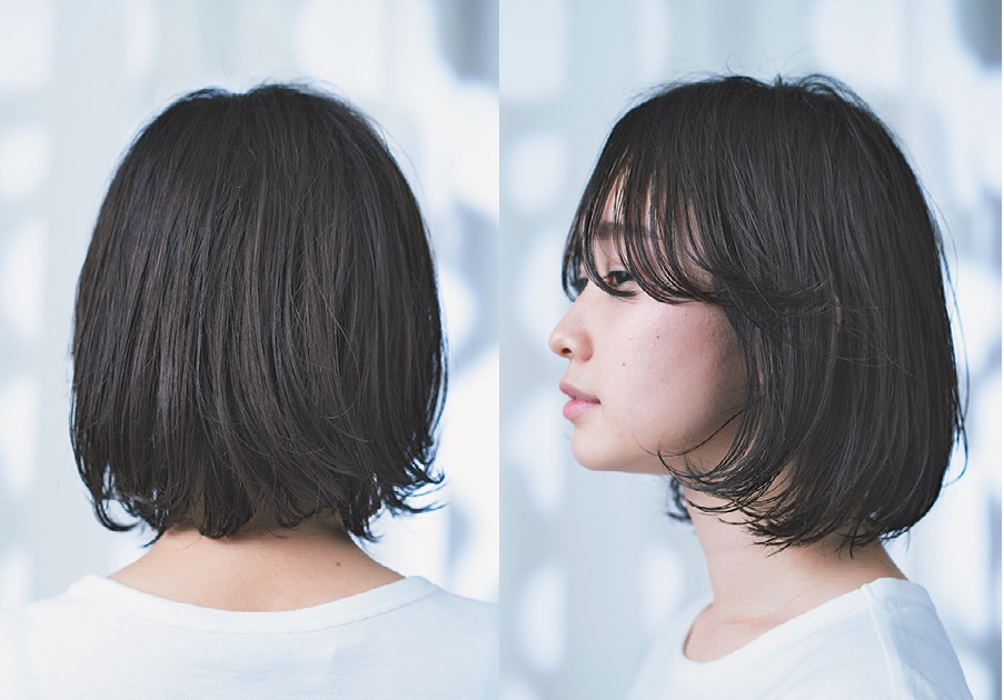 前上がりのラインで丸さを出し、前髪もややワイドぎみに幅を取ることで、柔らかさと女性らしさを表現。ストレートタッチのライン感のあるボブに深みのあるダークアッシュをONして、大人っぽくて清潔感のあるスタイルに。