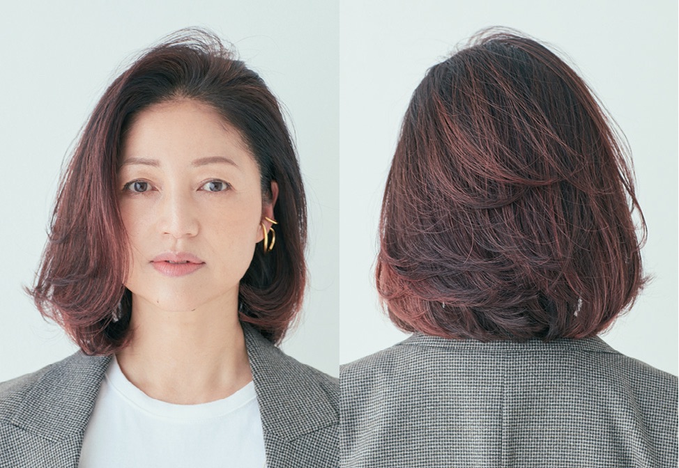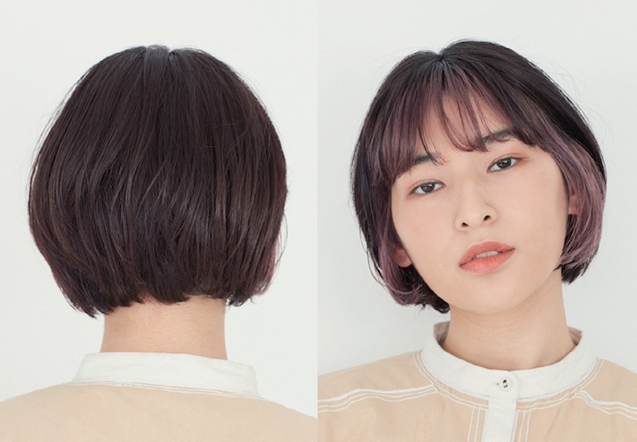 あえて量感を残したミディアムボブに、大人だからグロッシーな色味ではなくバイオレットにピンクをミックスし、ほどよいカジュアル感を演出。ハイライトの下にバレイヤージュを組み合わせ、フロントの毛先に色を集めたのがポイント。