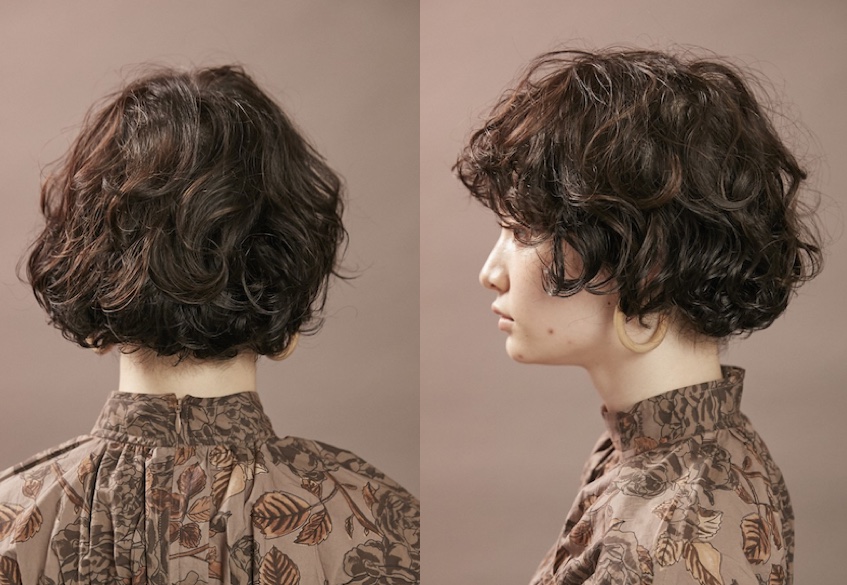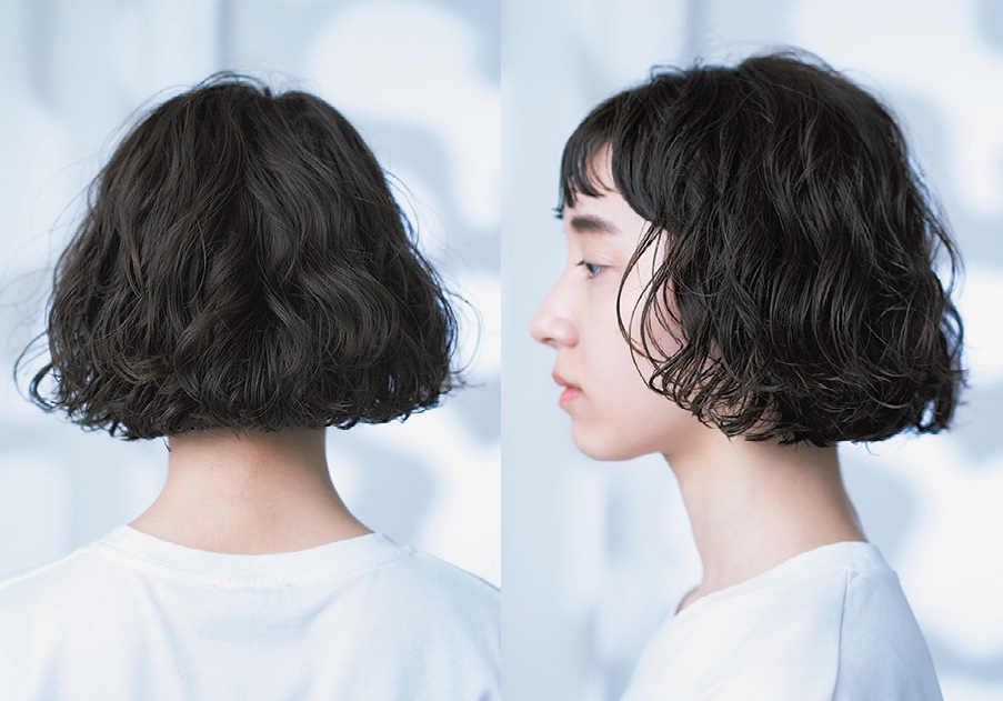 切りっぱなしボブを楽しんだら次は毛先がカールする程度のニュアンスパーマをプラス。隙間間のある束感をつくることで、コンパクトなシルエットはそのままに柔らかさと甘さがアップする。