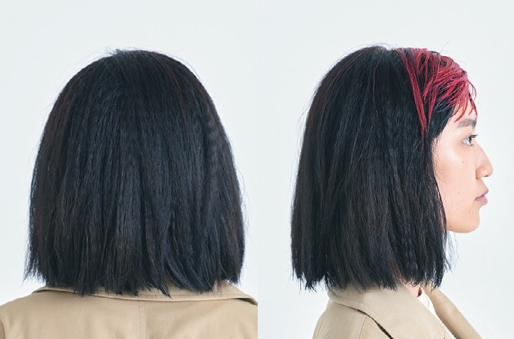 ハイトーン人気の今なら、これくらい大胆なデザインカラーもおすすめ。イメージしたのはなんと“電気”。切りっぱなしボブにピンクのバングは、電気のビリリっとした感じを形にしたもの。素材感のあるアップサイクルコーデのアクセントに。