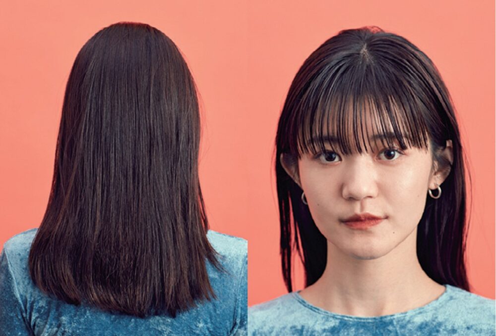 ライン感のあるミディアムスタイルにはぱらぱらとしたストレートタッチのバングをセレクト。ナチュラルさゆえ、どんなベースデザインとも好相性だが、適度なすき間をつくって、重くならないように。
