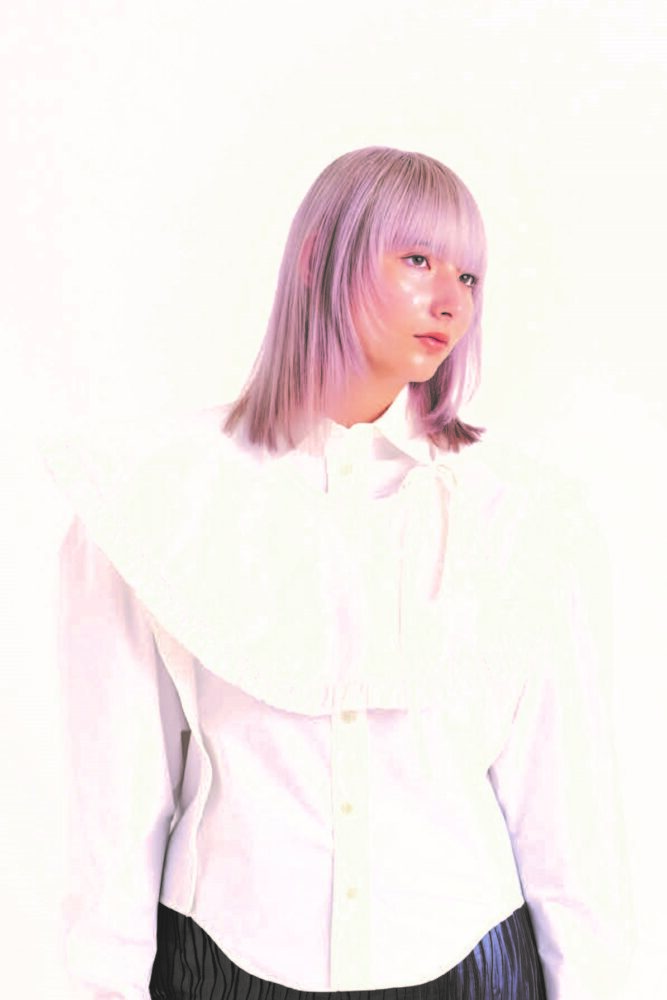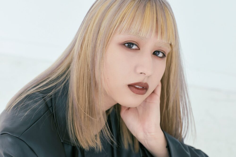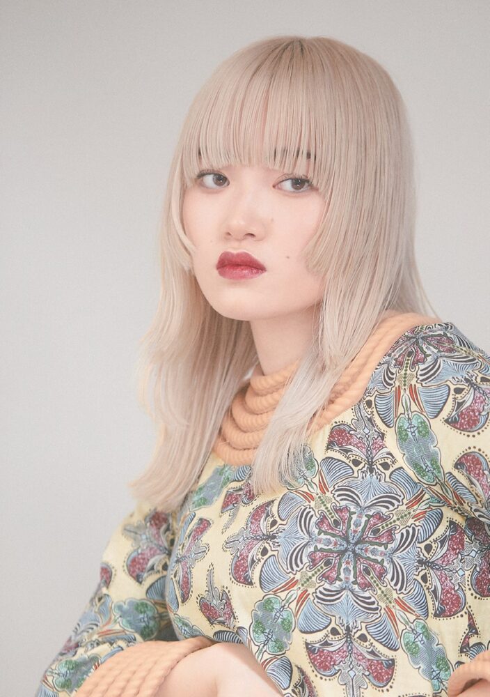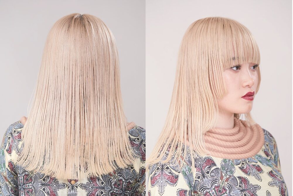 肩下のワンレングス。バングも目ギリギリにカットして重めに。顔まわりのみレイヤーを入れて軽さをプラス。安定感のあるカットベースに対し、カラーはハイトーンのパールピンクを。重×軽のミックスバランスで超個性スタイルを。