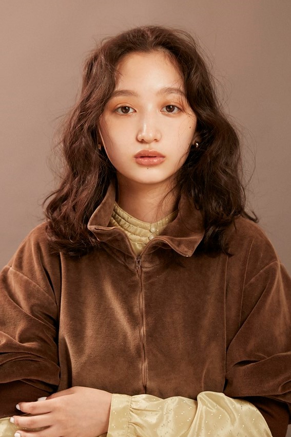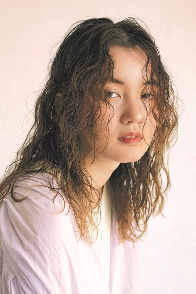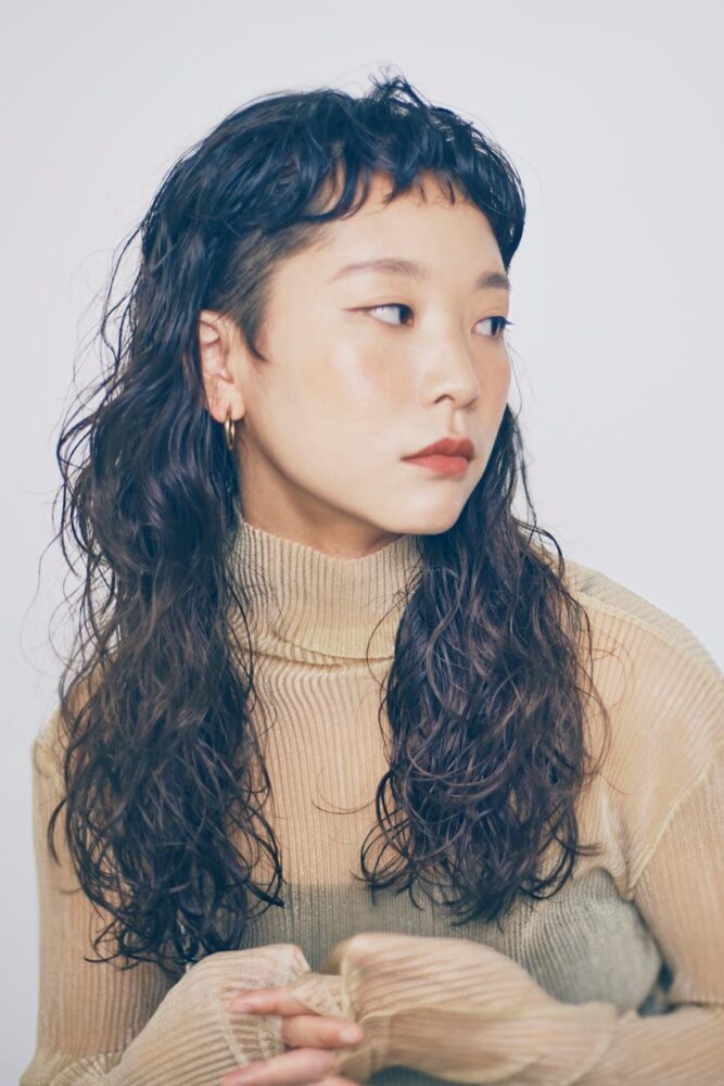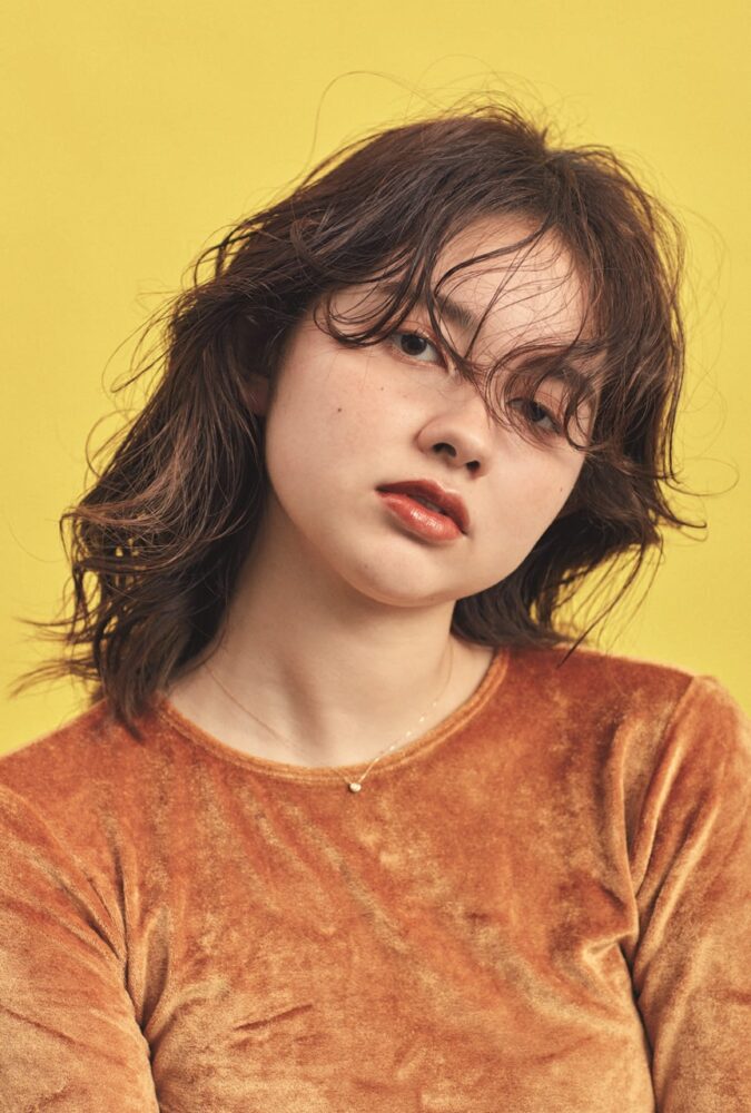 程よく重さのあるミディアムレイヤーにラフなカール感を持たせたパーマをON。毛先のランダムなハネ感がエアリーさを感じさせ、どこかアンニュイな表情を引き出す。
