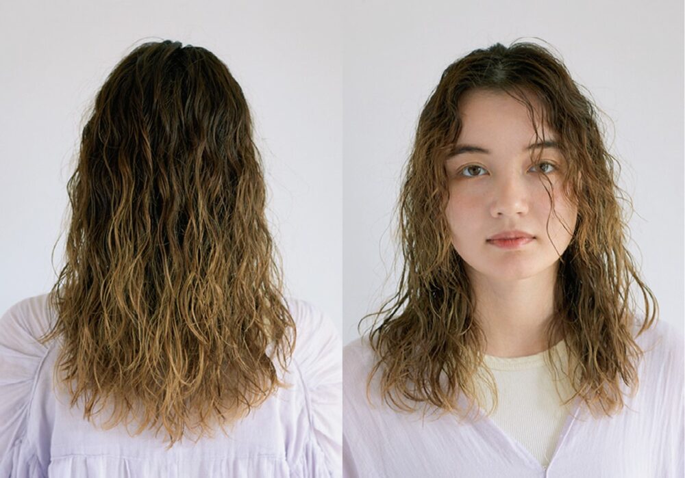 長めのパーマスタイルは毛先が重く見えがちなのでボリュームを抑えるように縦巻きパーマをON。力を入れすぎていないエフォートレスなスタイルはクセ毛のコントロール効果もあるセミロングスタイルに。