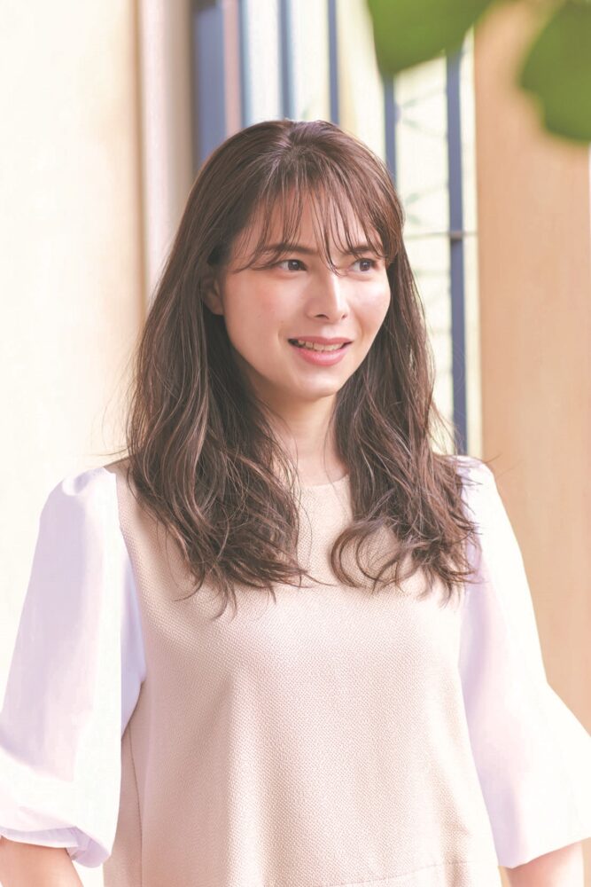ぺたんとしがちな前髪は根元ふんわりな韓国風“プリバング”に。立体感があるぶんボリューミーなミディアムとの相性もばっちり。柔らかなシースルー感を持たせることで華やかな雰囲気を演出できる。
