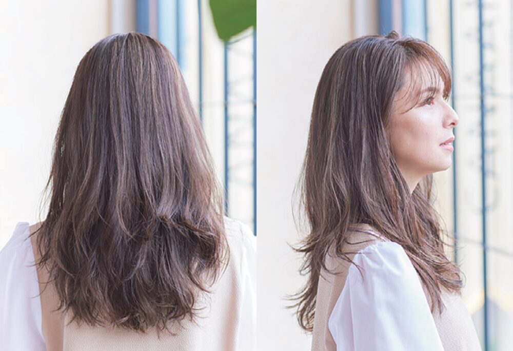 目にかかる長めの前髪と顔まわりに動きのあるレイヤーで大人の女性らしさを表現。極細のハイライトを全体に入れてオリーブベージュ をON。ハイライトが細いので髪のダメージを軽減し、褪色しても上品さをキープできる。耳下にスモーキーグレーのインナーカラーを忍ばせて、さりげない抜け感を。