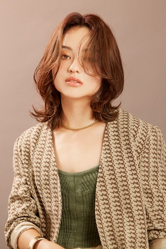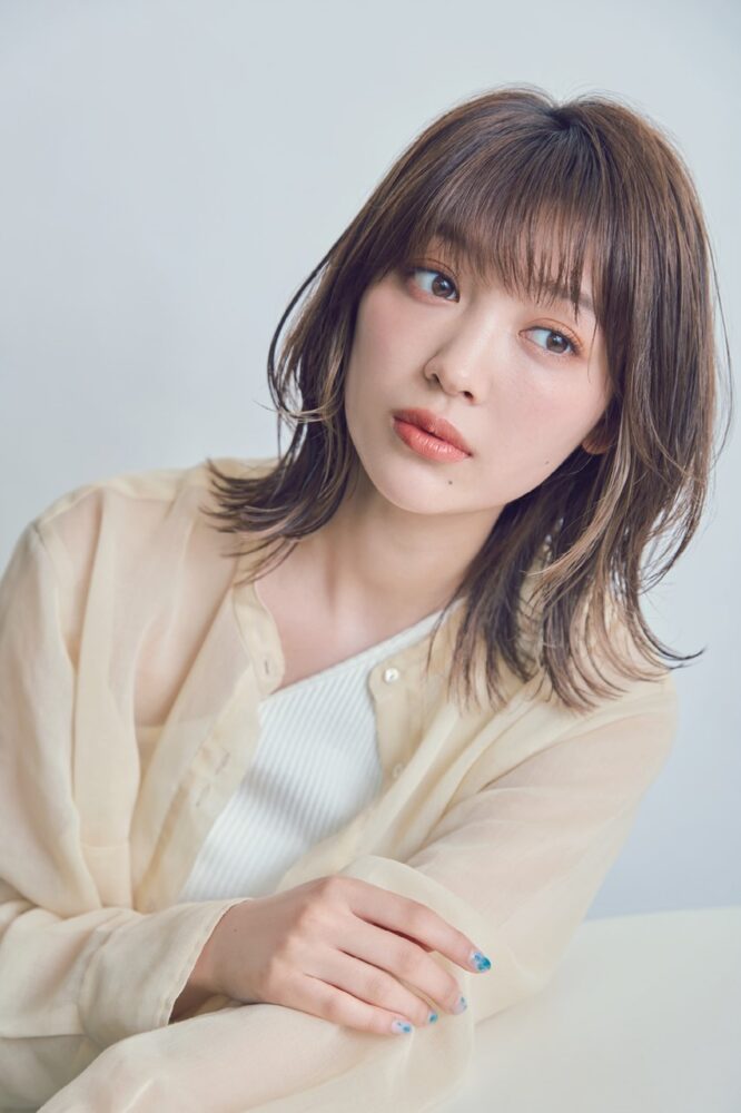 柔らかさを前面に押し出したミディアムレイヤースタイル。明るめのスモーキーブラウンのカラーが透明感をもたらし、軽やかな印象へ導く。シアーぎみのバングも洗練された雰囲気を好サポート。