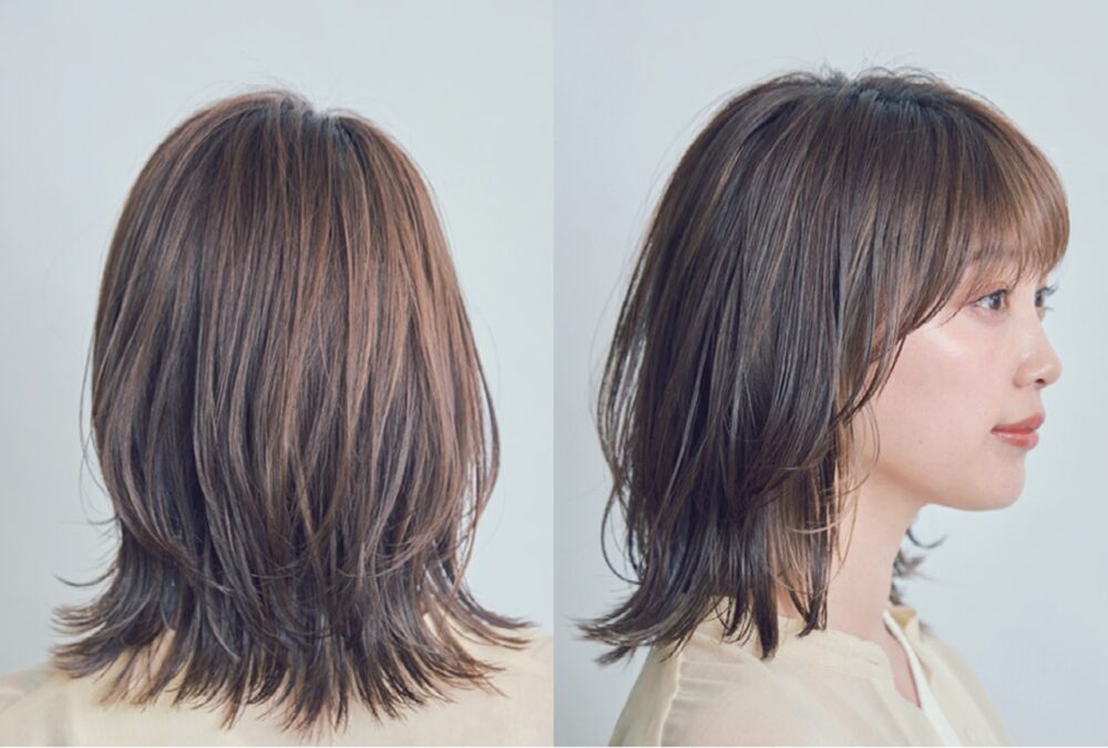 ボリューム感を持たせた前上がりのミディアムレイヤースタイル。ブリーチハイライトを入れ、グレージュブラウンをON。トナーで彩度を加えることでより自然な立体感と透明感が演出される。大人にぴったりのセミロングスタイルだ。