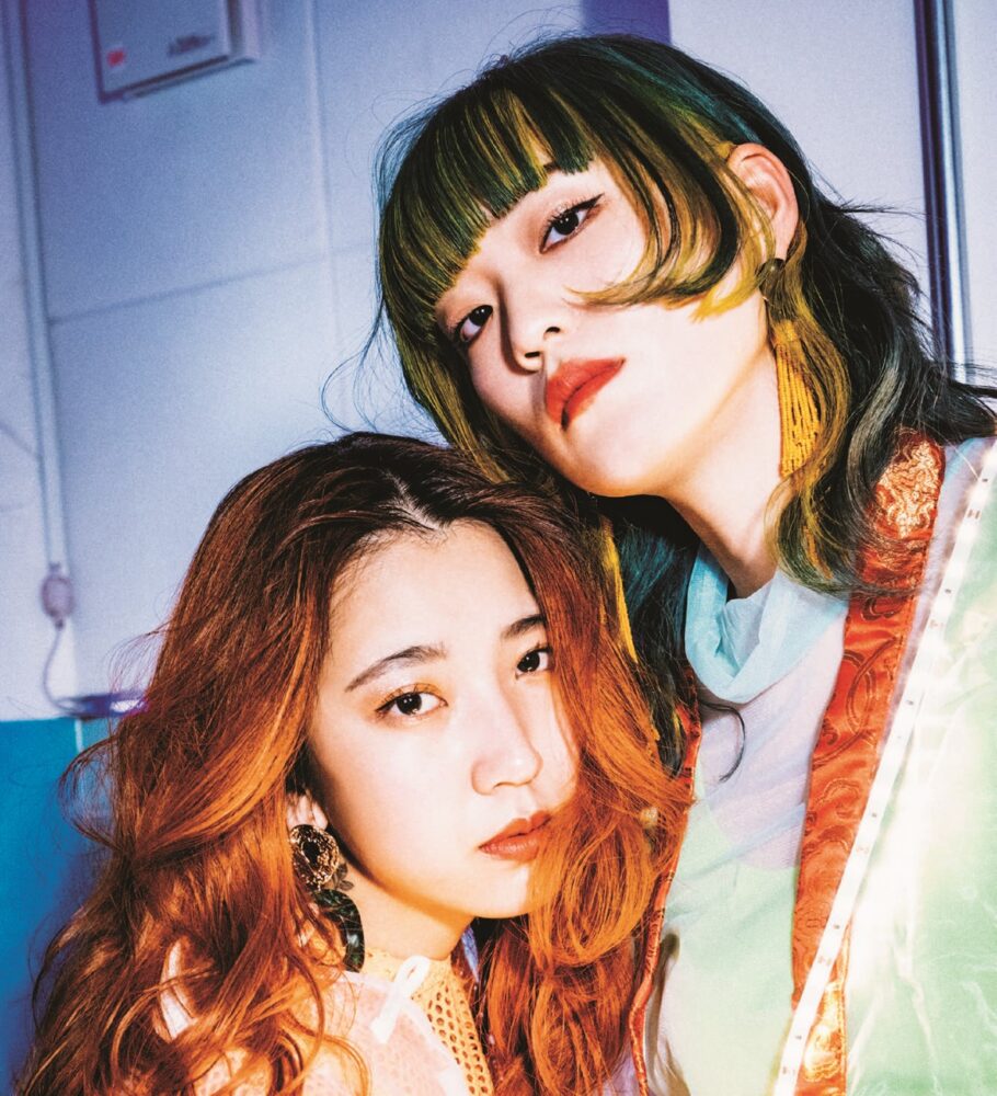 原宿カルチャーとポップさを融合した長めレイヤースタイル。左のウェービーなスタイルには暖色、右のタイトなウルフ系には寒色をON。ヘアのタイプに合うカラーをミックスすることでデザイン性がより強調される。