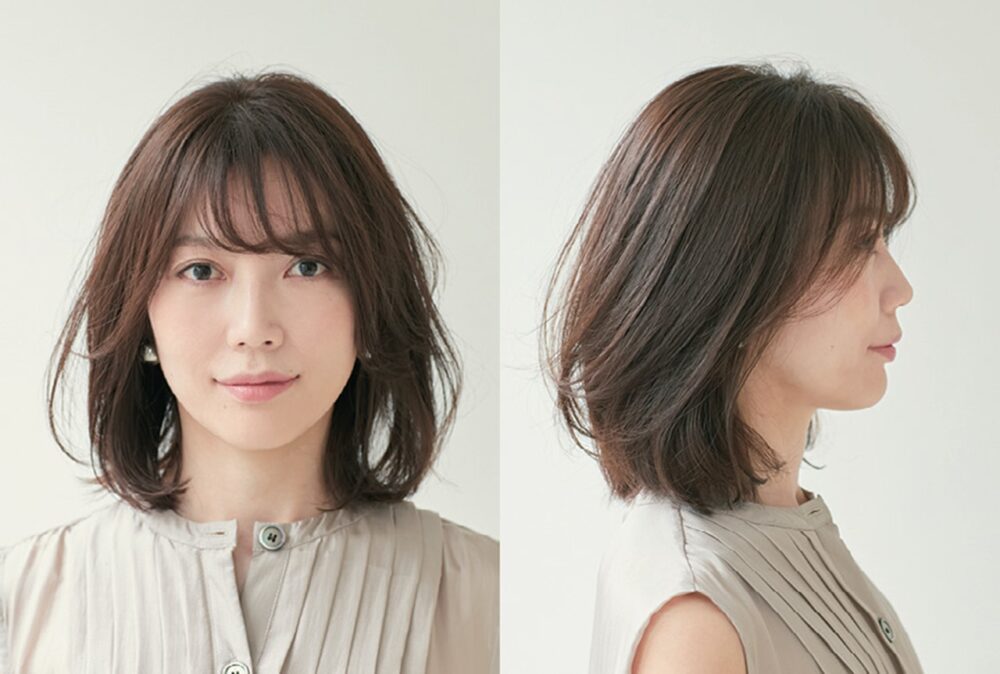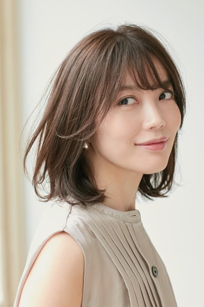 トレンドに左右されないミディアムスタイルは、バングで個性を。似合わせを意識したアシメバングなら短めに切り込んでも子供っぽくならない。肌が見える面積が増えるため目元がぐっと明るい印象になる。