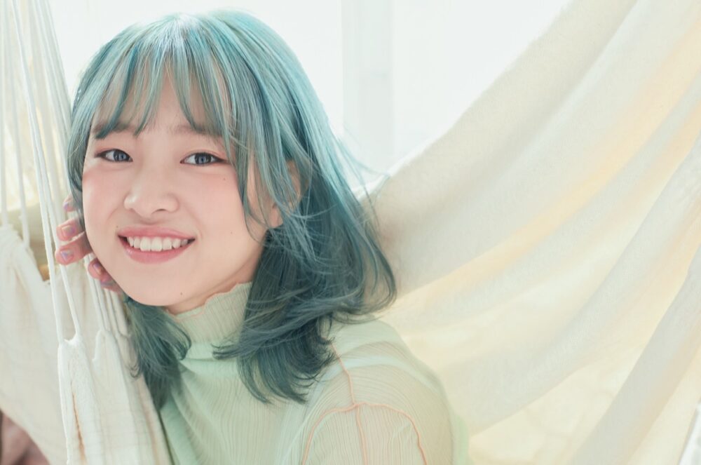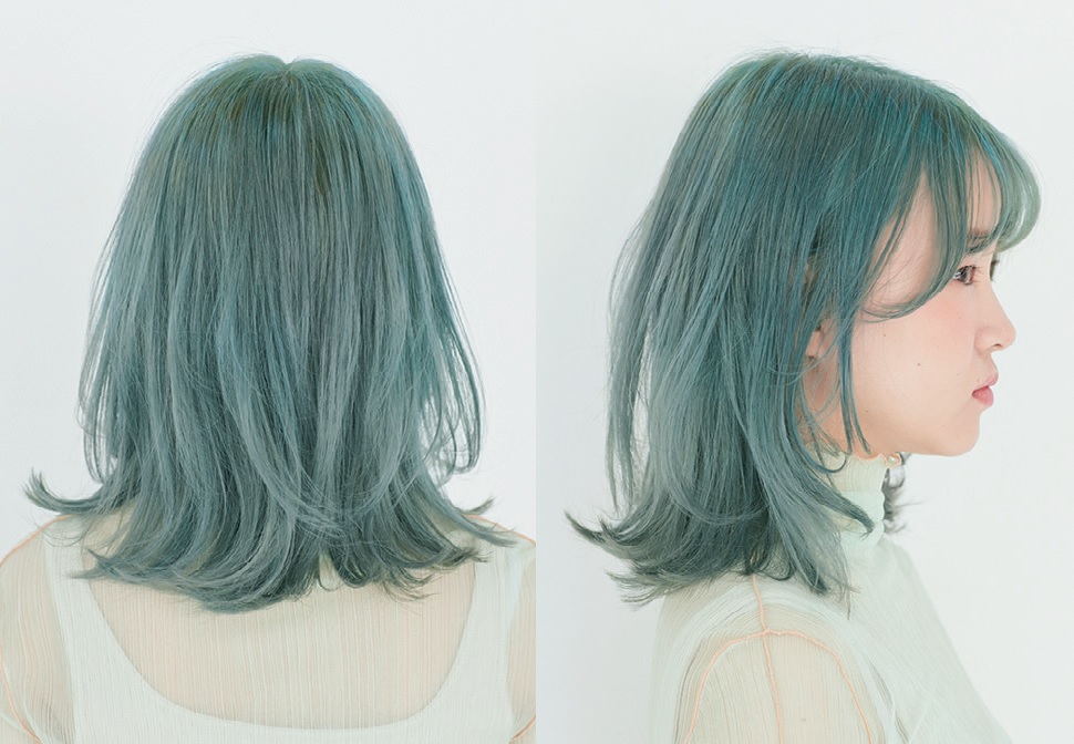 切りっぱなし風のミディアムレイヤーにくすみ感のあるハイトーングリーンをON。シンプルなヘアスタイルもカラーとの組み合わせ次第で個性やこだわりが表現できる。