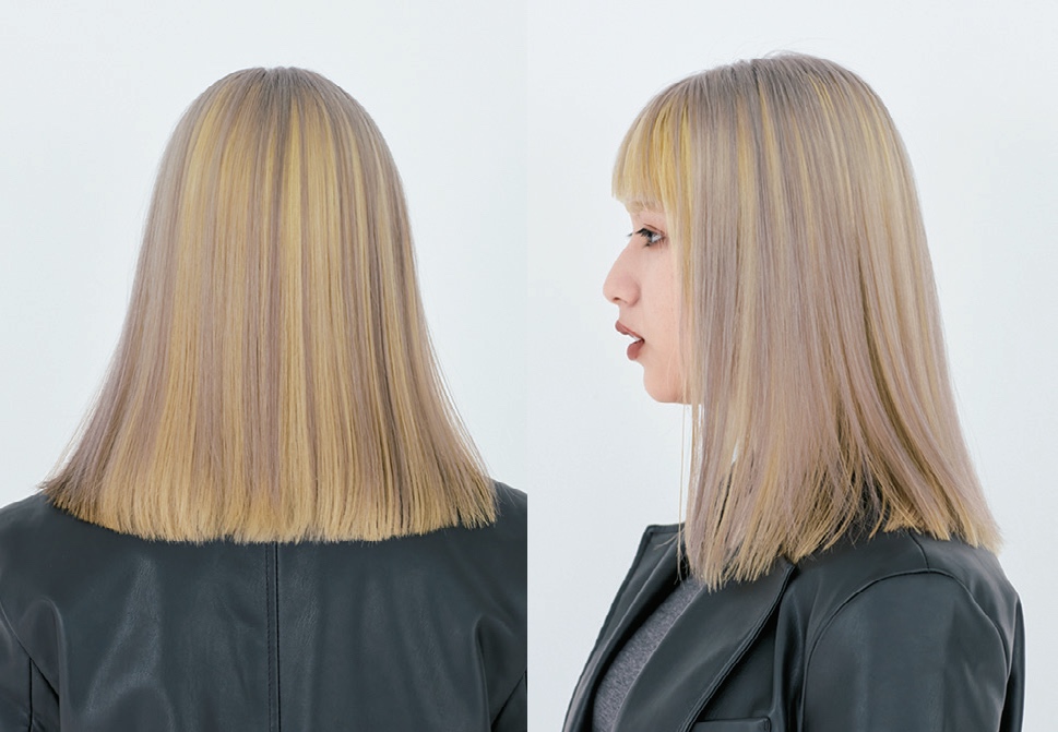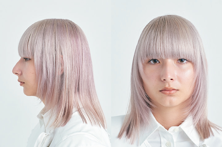 肩下のワンレングス。バングも目ギリギリにカットして重めに。顔まわりのみレイヤーを入れて軽さをプラス。安定感のあるカットベースに対し、カラーはハイトーンのパールピンクを。重×軽のミックスバランスで超個性スタイルを。
