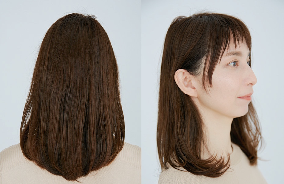 ライン感のあるミディアムスタイルにはぱらぱらとしたストレートタッチのバングをセレクト。ナチュラルさゆえ、どんなベースデザインとも好相性だが、適度なすき間をつくって、重くならないように。