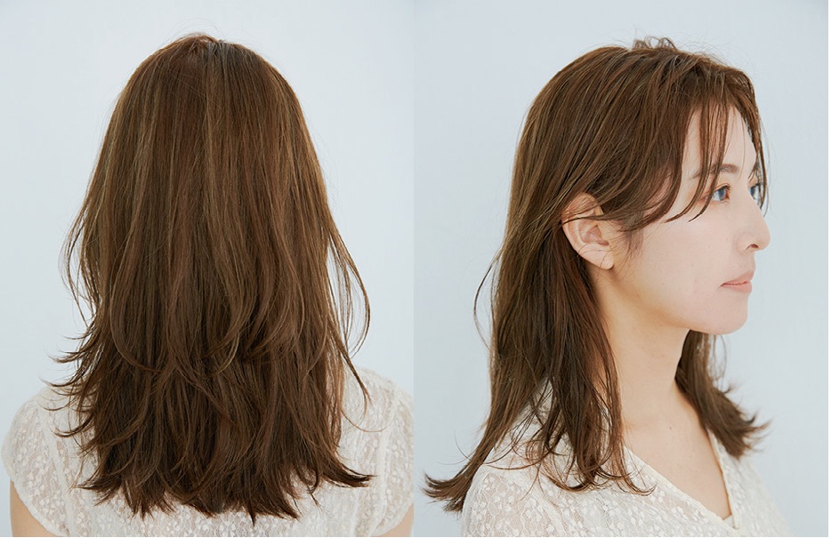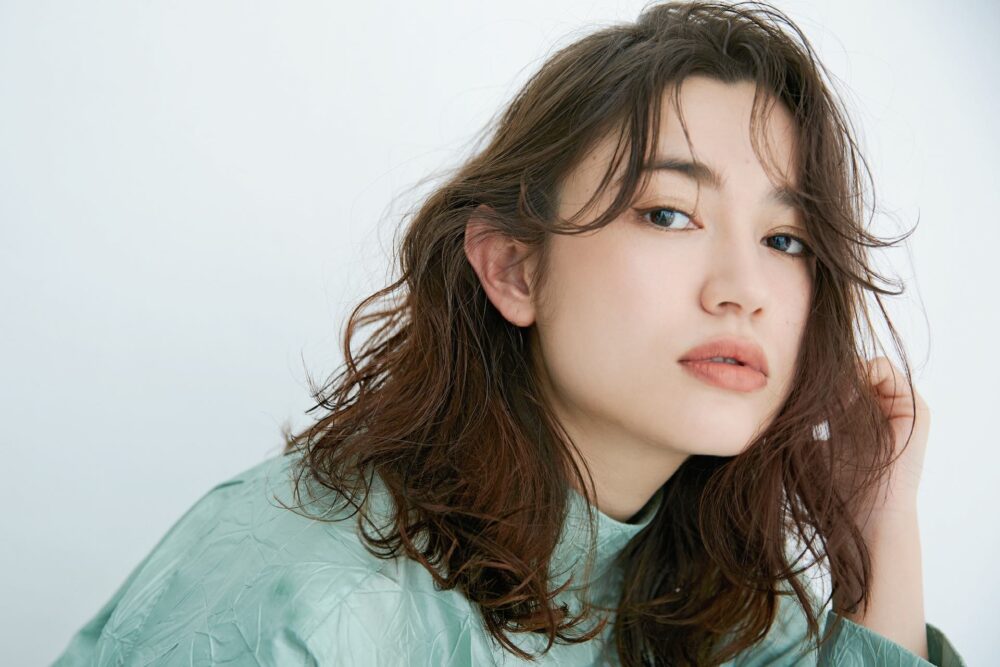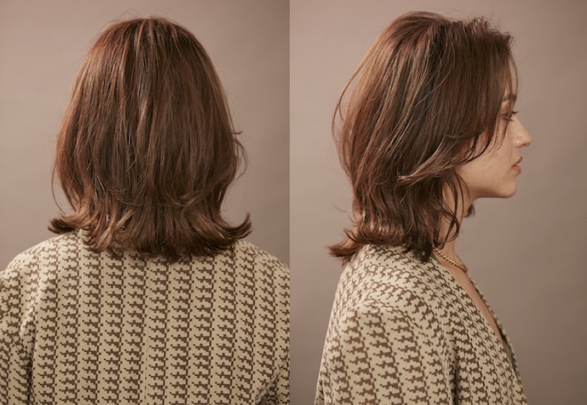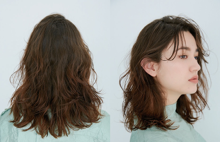 程よく重さのあるミディアムレイヤーにラフなカール感を持たせたパーマをON。毛先のランダムなハネ感がエアリーさを感じさせ、どこかアンニュイな表情を引き出す。