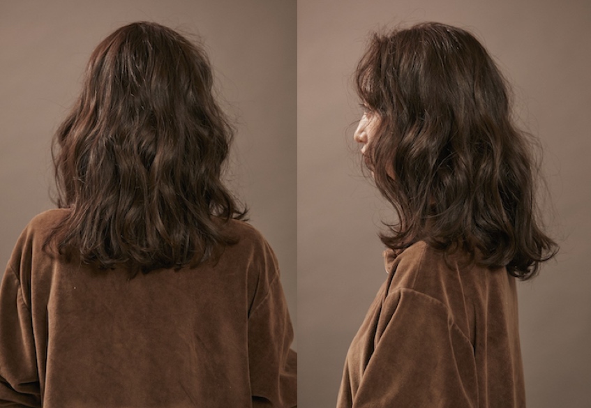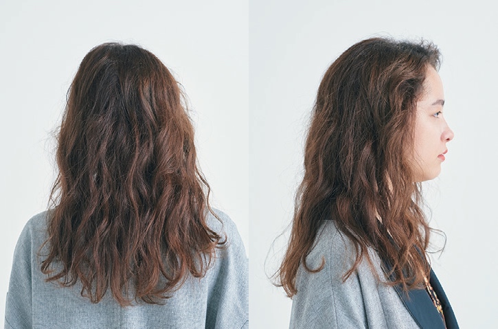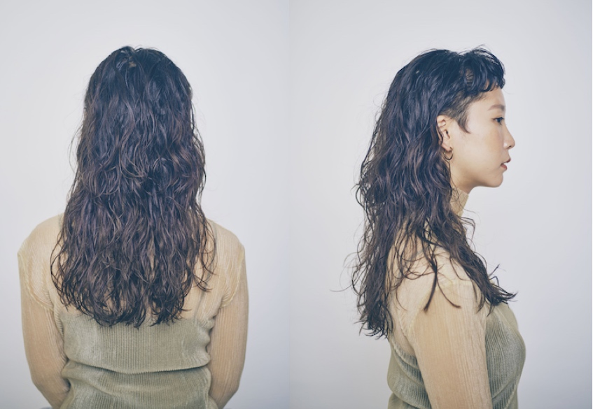 長めのパーマスタイルは毛先が重く見えがちなのでボリュームを抑えるように縦巻きパーマをON。力を入れすぎていないエフォートレスなスタイルはクセ毛のコントロール効果もあるセミロングスタイルに。