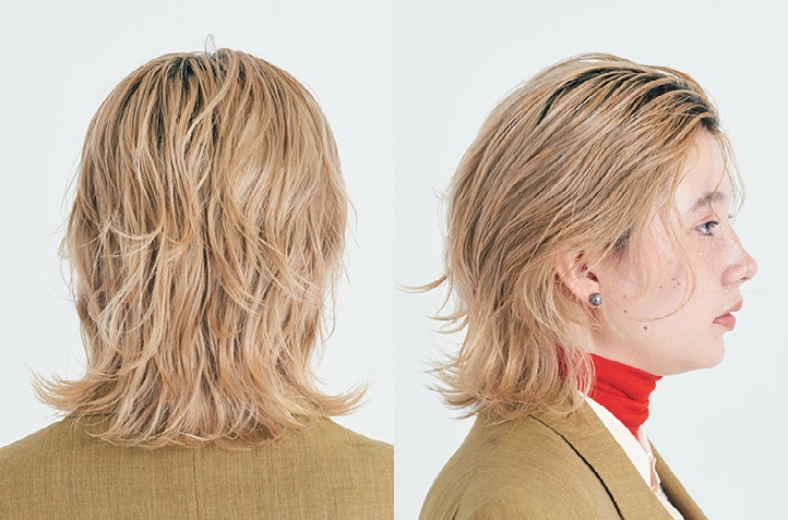 今旬のウルフはレイヤーをベースに考えつつも、グラデーションで厚みを残す所としっかり切り込む所の差をつけることが大切。鎖骨レングスくらいで毛先を外ハネにし、くびれをつくりながらひし形シルエットにするとバランスがよくなる。