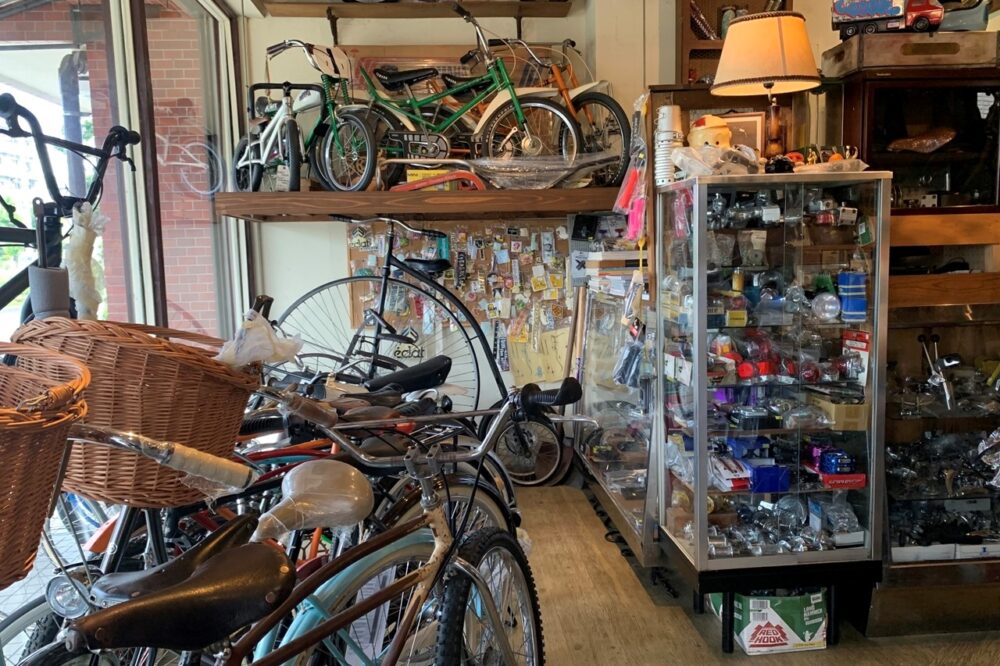 私が購入したプロムナードは一見フラットにも見えるが、わずかにライズがあるおかげでビンテージらしい佇まいも感じさせるもの。でも、これを逆さにつけるって? そんなこともありなのか!? 実際に当てがってみると確かにイケてる。天返しなどとも呼ばれる手法のようだ。さらにブレーキワイヤー類の長さの調整が必要かもしれないとのことで、小さなパーツ類も一応購入し、セルフカスタムの方法を聞いて、店を後にした。