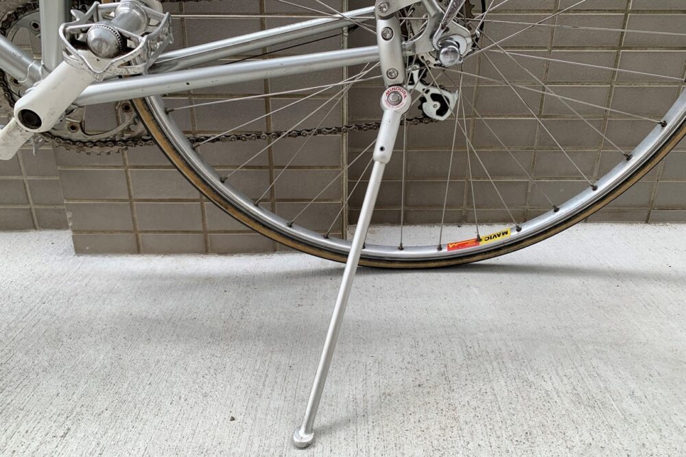 これまでは目的地に行ってワイヤー式の鍵で何かにくくりつければ事が足りたのだが、通勤時に駐輪場に止めるとなると、やはりスタンドが必要ということで、キックスタンドの取り付けを行った。当初は2足のセンタースタンドを検討していたものの、フレーム形状から取り付けは難しく断念。サイドのキックスタンドは「取ってつけた感じ」でシンプルなロードバイクには似合わないと思っていたので、あまり気乗りしなかったが、たまたま見つけた風変わりな自転車店で相談したところ、フレームの色にかなり近く、スリムで外観を損なわないものを発見してくれた! そこで一気にセルフカスタムへの熱量が湧き出してきたのだ。