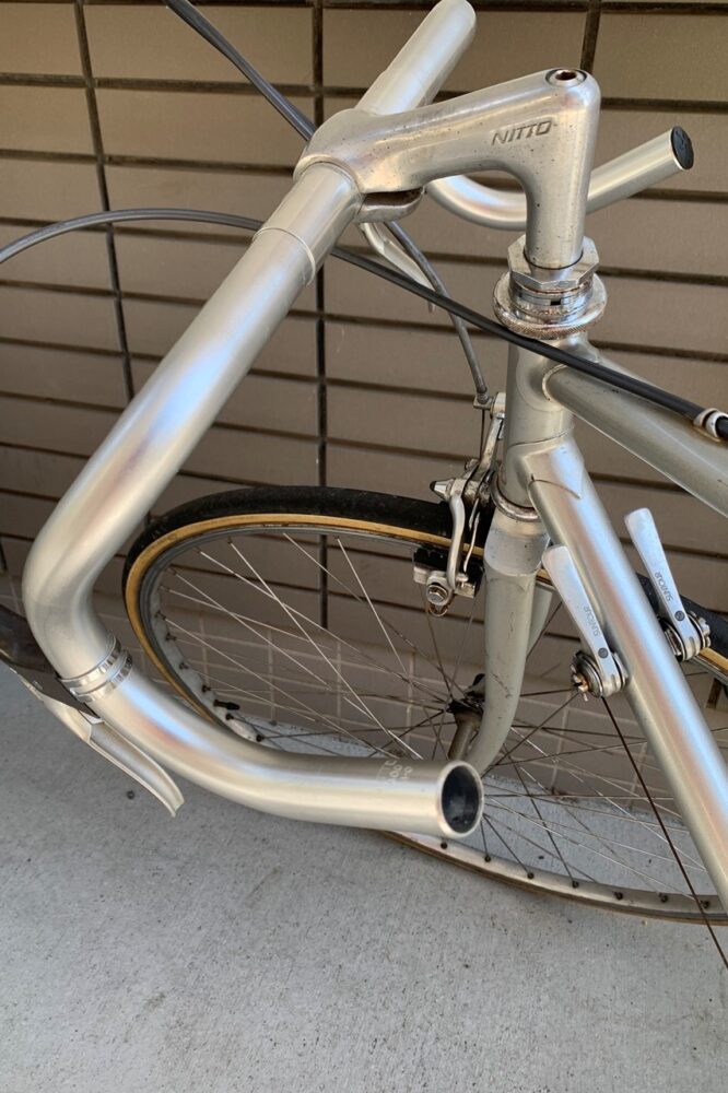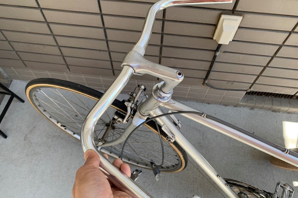 そこでハンドルも「FUNNY’S B.C.S.」の丸屋さんに相談したところ、店内をゴソゴソと探したのちに、プロムナードのハンドルバーを手渡され「逆さにしたら似合いますよ」と。プロムナードとは「遊歩道や散歩道」などを指すフランス語。その名の示す通り、言ってしまえばママチャリ的な楽なポジションのハンドル。とはいえ一辺倒とは言えず、ライズの具合によって印象は結構異なる。