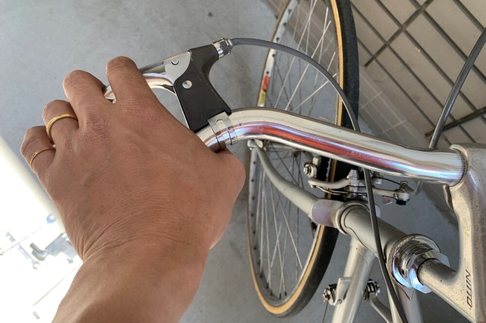 しかし今度はブレーキレバーの設置。どの位置、角度にするか。これがなかなか難しい。握りやすさと外見のカッコよさを両立する場所を探さなくてはいけない。レバー位置や角度を検討しているうちに、またハンドル角度の再検討に戻って……を繰り返すこと数十回。レバー形状とハンドルの形状の相性にもよるのだろうが、やっぱりここはすんなりとは行かない。ハンドルの両端にある直線部分にレバーをつけ、地面に向かって垂直にレバーをつけるのがプロムナードとしては一般的なのだろうが、なんだかしっくりこない。結果としては、ハンドルと並行するような角度にしてみた。バーハンドル的な握り心地といえば伝わるだろうか。そしてこの位置にすることで、(面倒だったこともあり)ブレーキワイヤーの長さの調整は不要と判断。つまり、あとはバーテープを巻くだけ!
