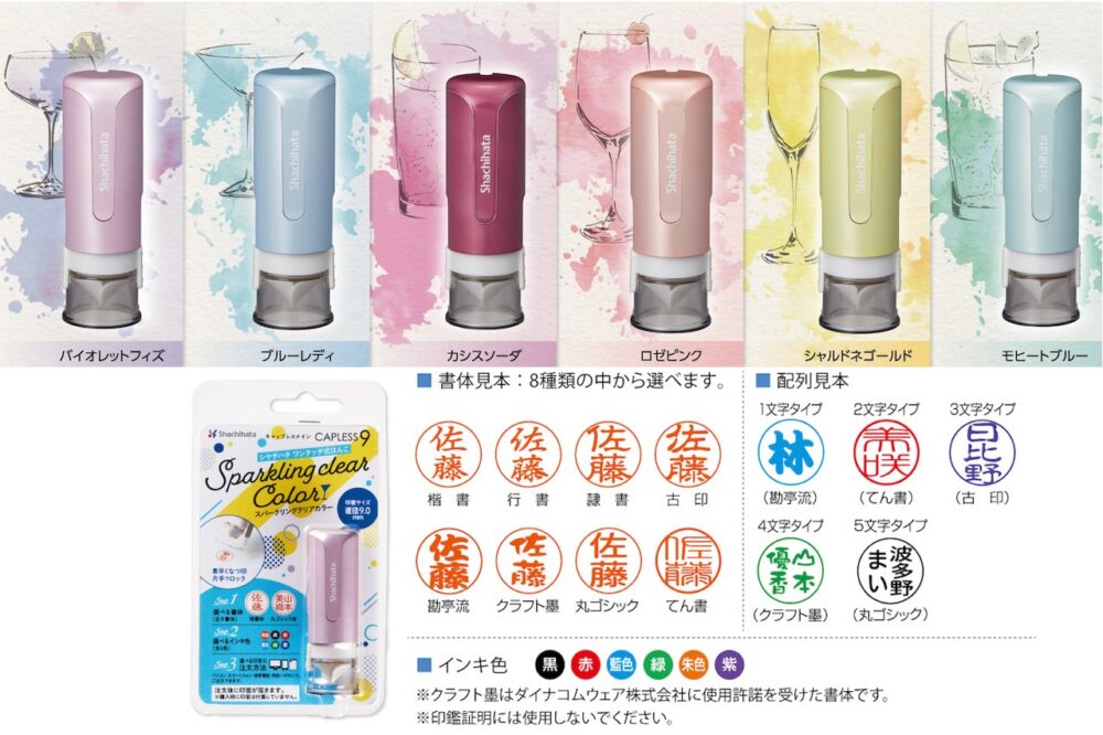 シヤチハタは、この度、 片手でスマートになつ印ができる「キャップレス 9」にスパークリングクリアカラーの6色を追加し、6月7日(火)に発売。