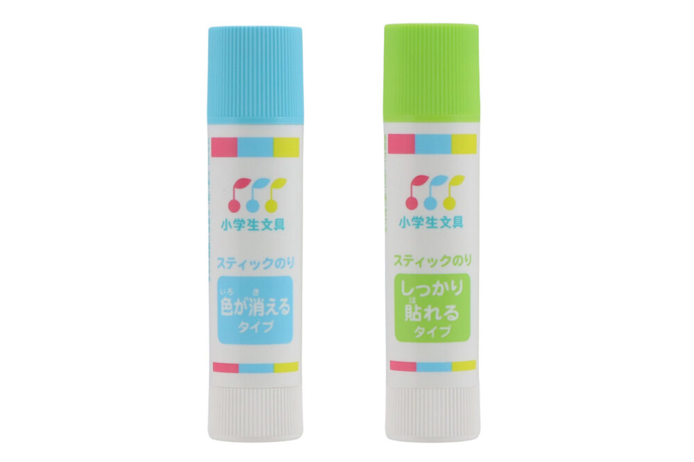 その小学生文具から今回新たに、スティックのり①色が消えるタイプと②しっかり貼れるタイプを拡充することとなった。①はブルー発色で塗ったところが分かり、 乾くと透明になる。②は封筒、画用紙、 厚紙も強く接着できる。また、両アイテムとも、小学生が使用しやすい大きめの名前欄付き。