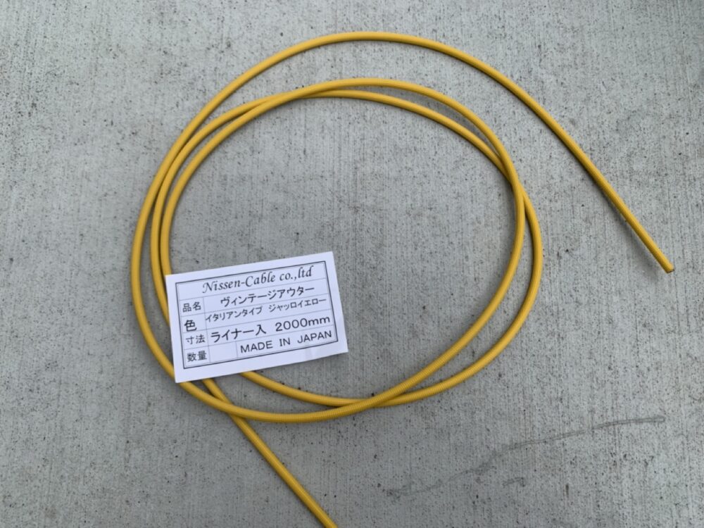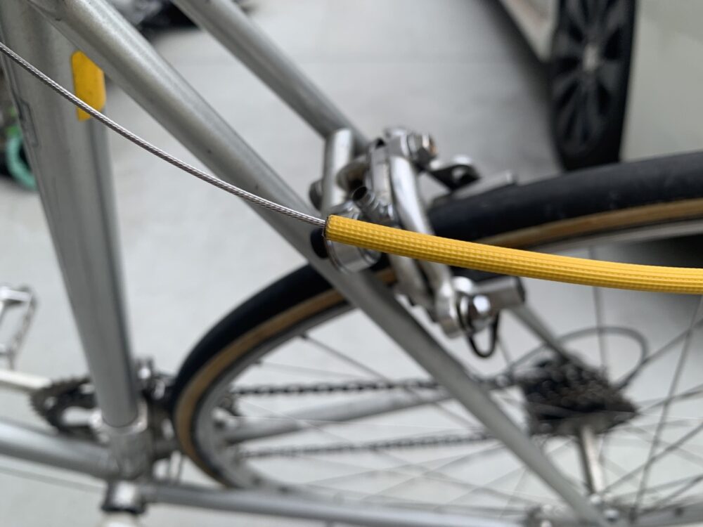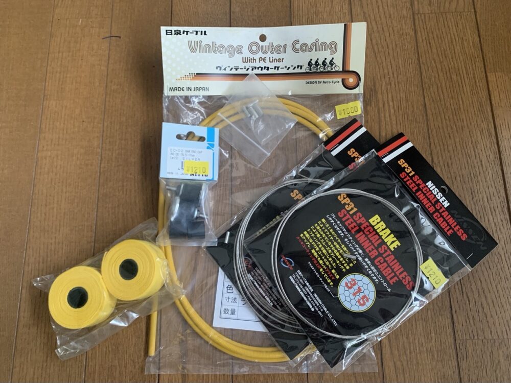 シェラックニスはアンティークの家具や楽器などにも使われるニス。天然由来の樹脂状のもので、塗膜が硬いことが特徴で塗装を重ねることで深みのある光沢を生み出すというので、ぜひ今後チャレンジしたい。見かけるのは白い綿テープにニスを塗り重ねた飴色のハンドルだが、偶然にも黄色の綿テープを発見したので、同系色のブレーキワイヤーのチューブと合わせたいというカスタム熱が高まった。