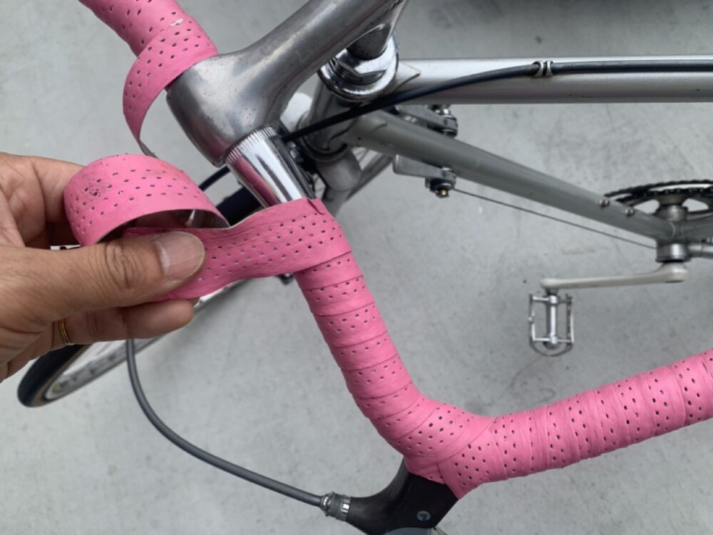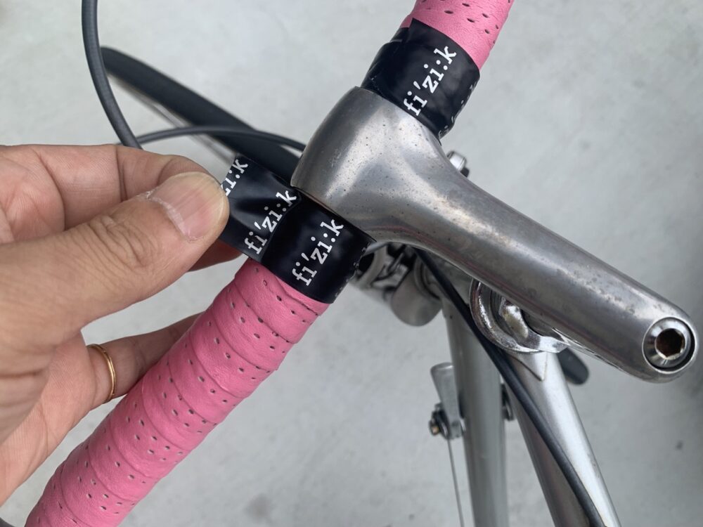 まずは、これも以前に自分で巻いたド派手なピンクのバーテープを剥がしていく。ハンドル中央のビニールテープを剥がしてから、バーテープをクルクルと剥がしていくだけ。ここまではなんの緊張感もなくできる。そしてブレーキレバーの位置や角度を変えるため、インナーワイヤーを外す。フロント&リアともにワイヤーのエンド側を外し、ある程度自由に動くようにしておく。