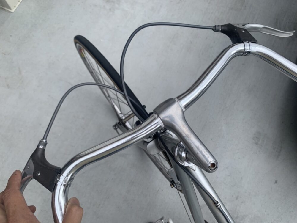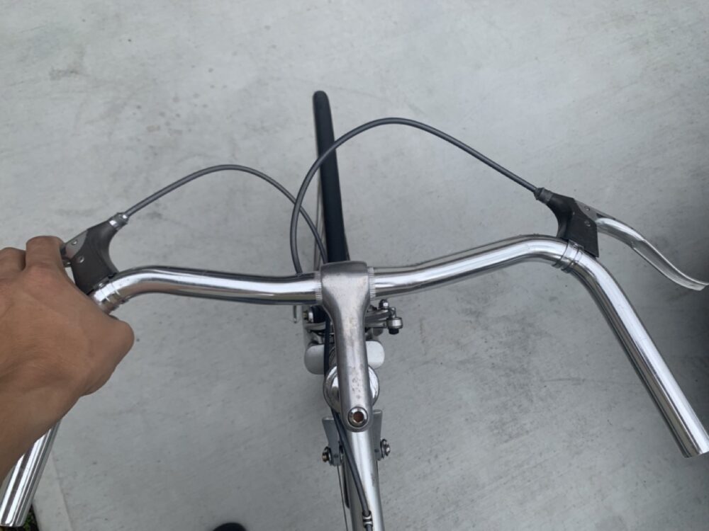 違和感を感じていたハンドルの角度とブレーキレバーに目を向ける。プロムナードハンドルを上下逆さまにし、少し前傾気味に取り付けていたため、思ったほど姿勢が楽ではなく、さらにブレーキレバーを地面と並行につけていたこともあり、バーハンドル的な姿勢になっていた。街乗り仕様にカスタムするつもりだったのだが、見た目のかっこよさで選んだ角度なのだが、少々気楽さにかけていた。