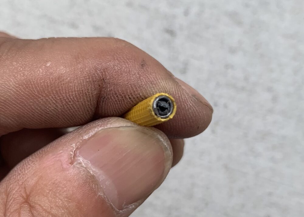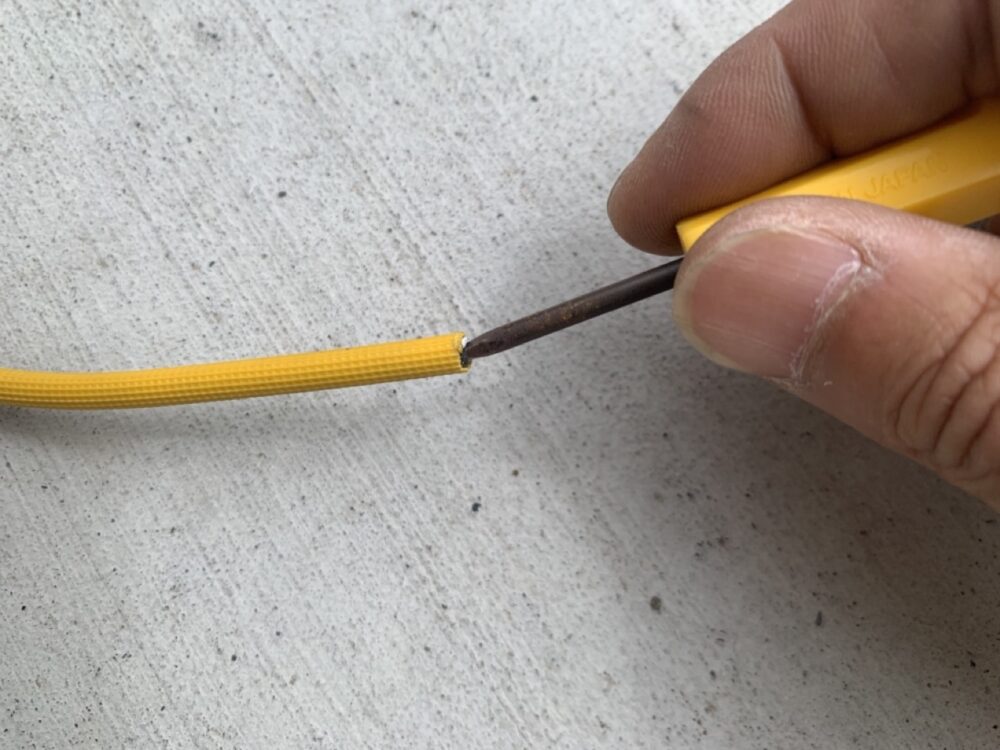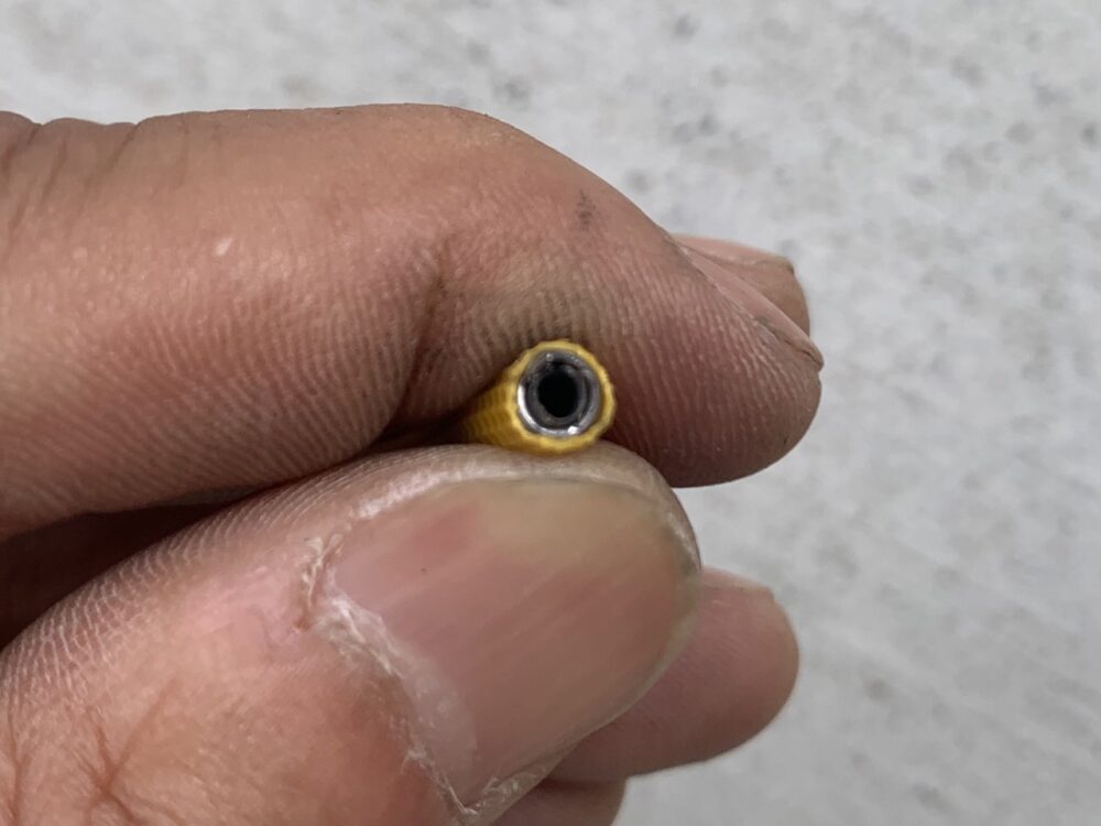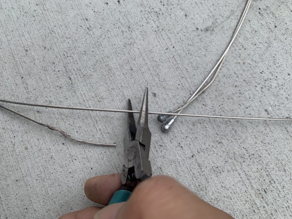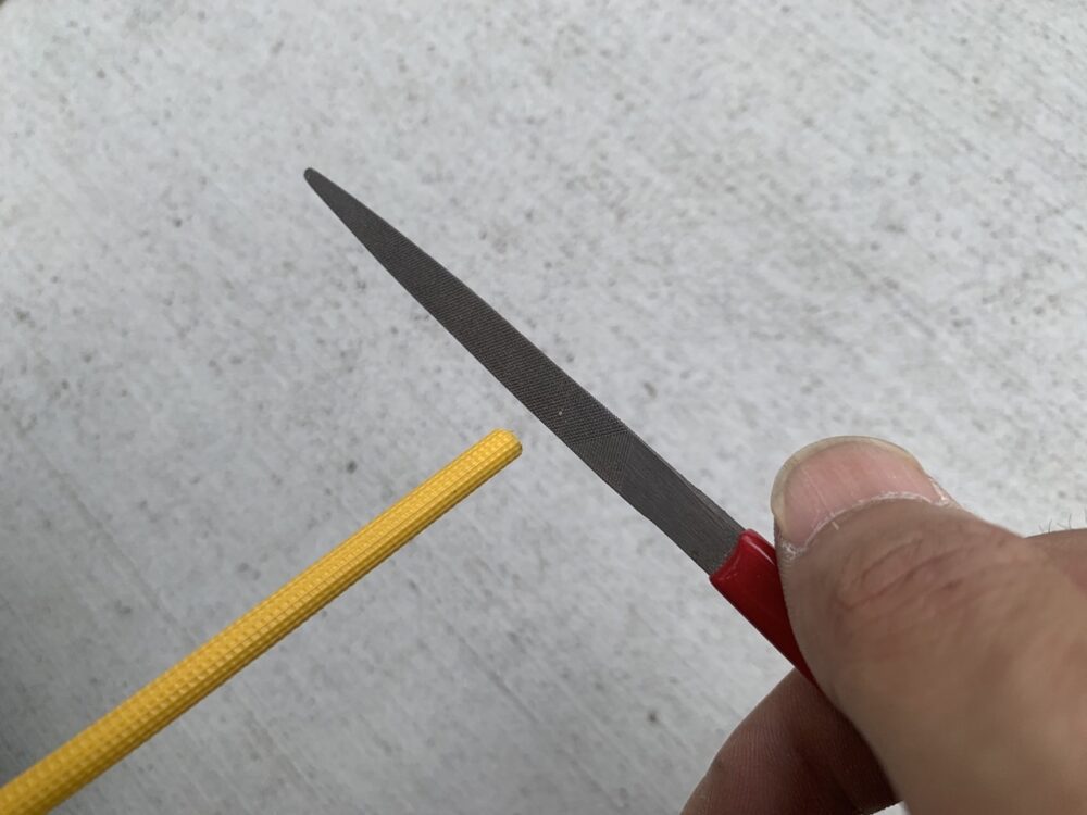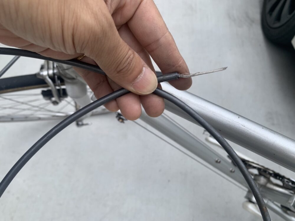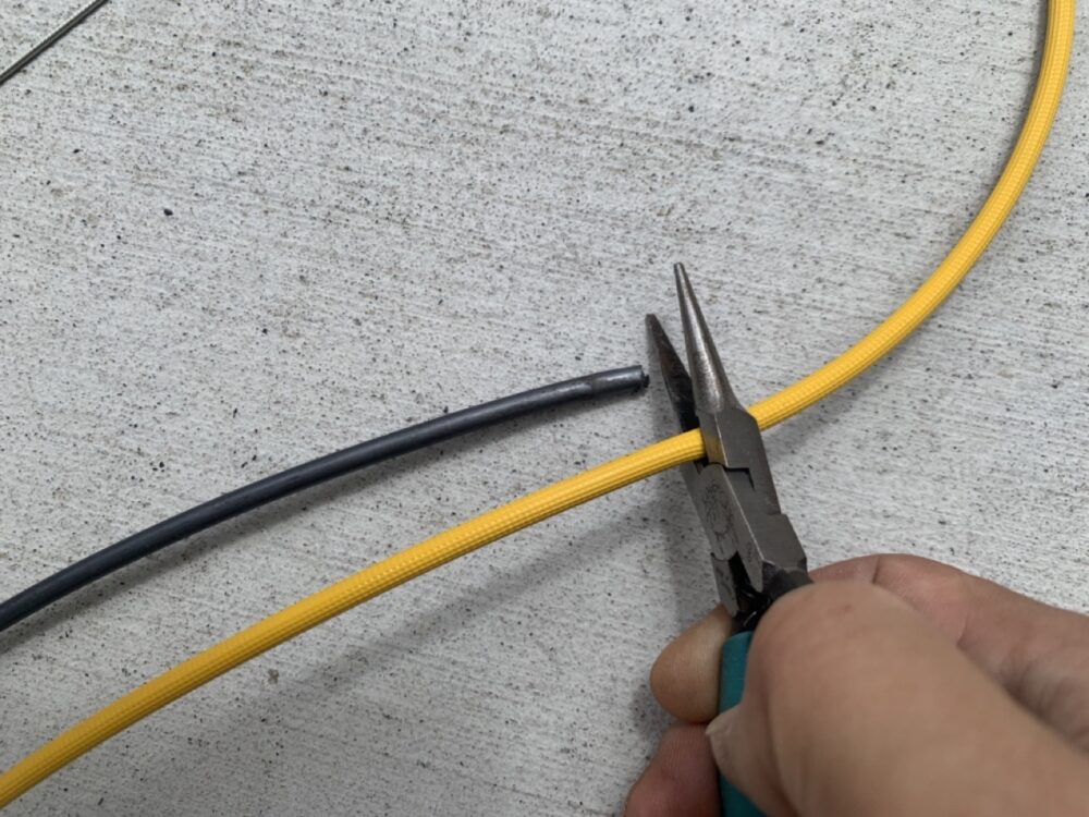 切断したアウターチューブは切断面が潰れてしまうため、キリや画鋲などで穴の部分をグリグリして切断面を丸く整える。また切断面にはバリが残ってワイヤーに干渉してしまう可能性があるため、棒ヤスリを使用してバリを取り除く。そうしたらあとはインナーワイヤーに通すだけ!
