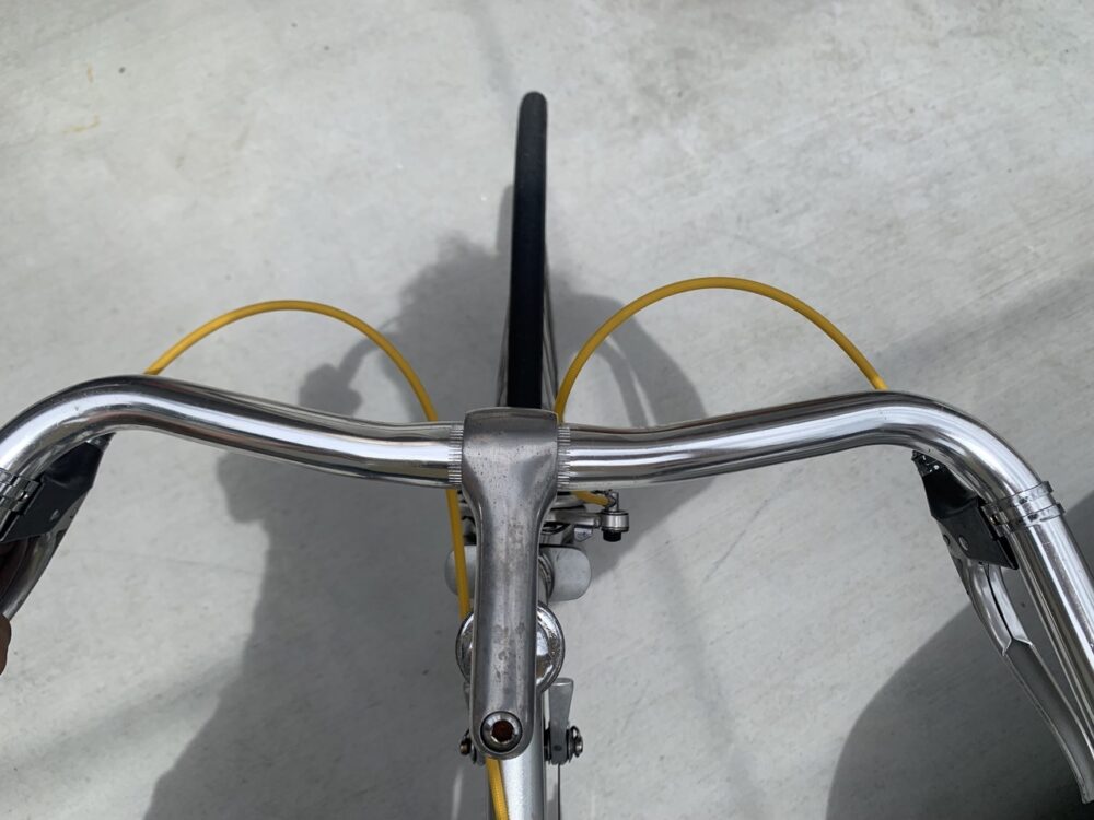 3. より気楽な姿勢へとハンドル&ブレーキレバーをポジション変更し、ブレーキワイヤーチューブとバーテープをイエローで統一したプロムナードのポップなクロモリバイク