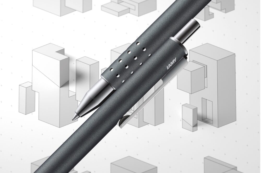 「ラミースウィフト」はワンノックで筆記が可能で、軽快な書き味が魅力のキャップレスローラーボール。筆記時にボディに収納される仕組みのクリップや、滑り止め効果を持ちながらデザイン上のアクセントにもなっているパンチングなど、高い精度で加工されたボディは「ドイツの精密な工業製品」 を想起させる。