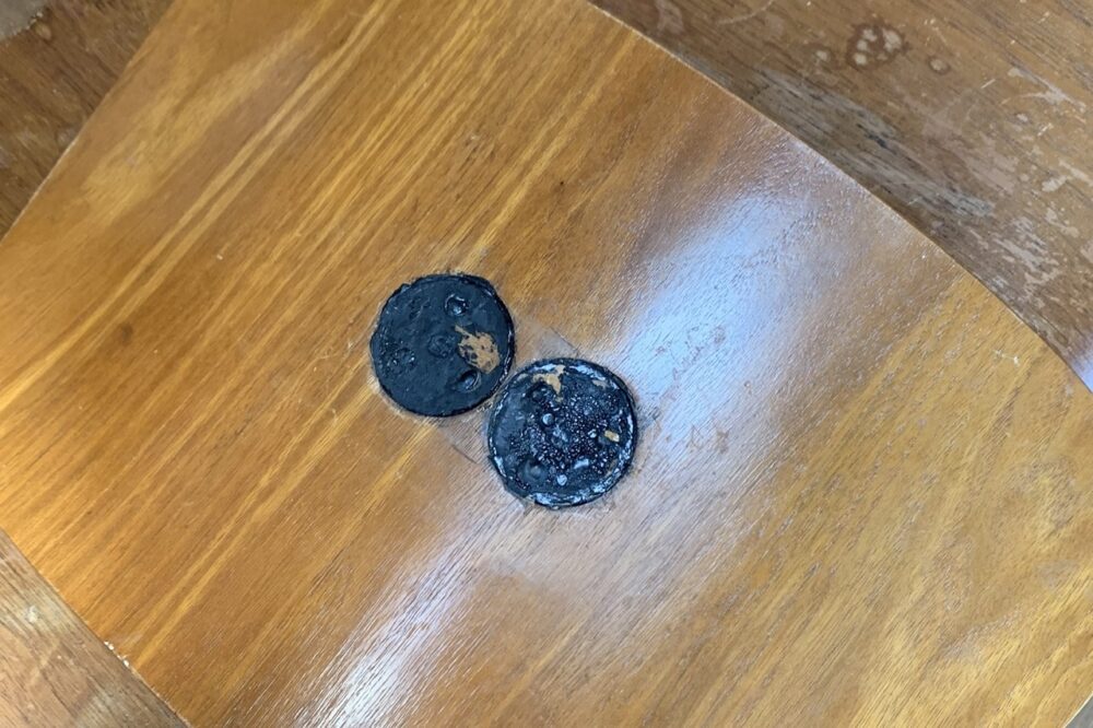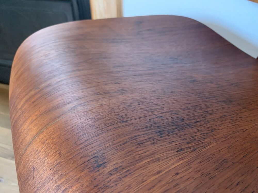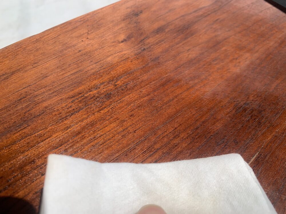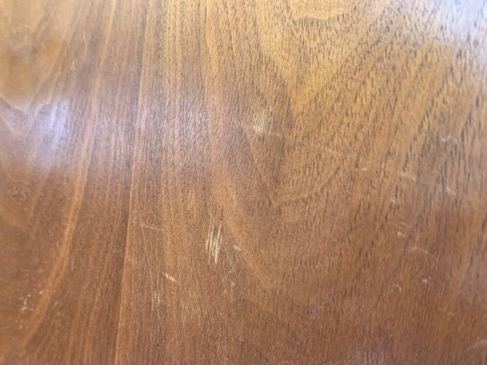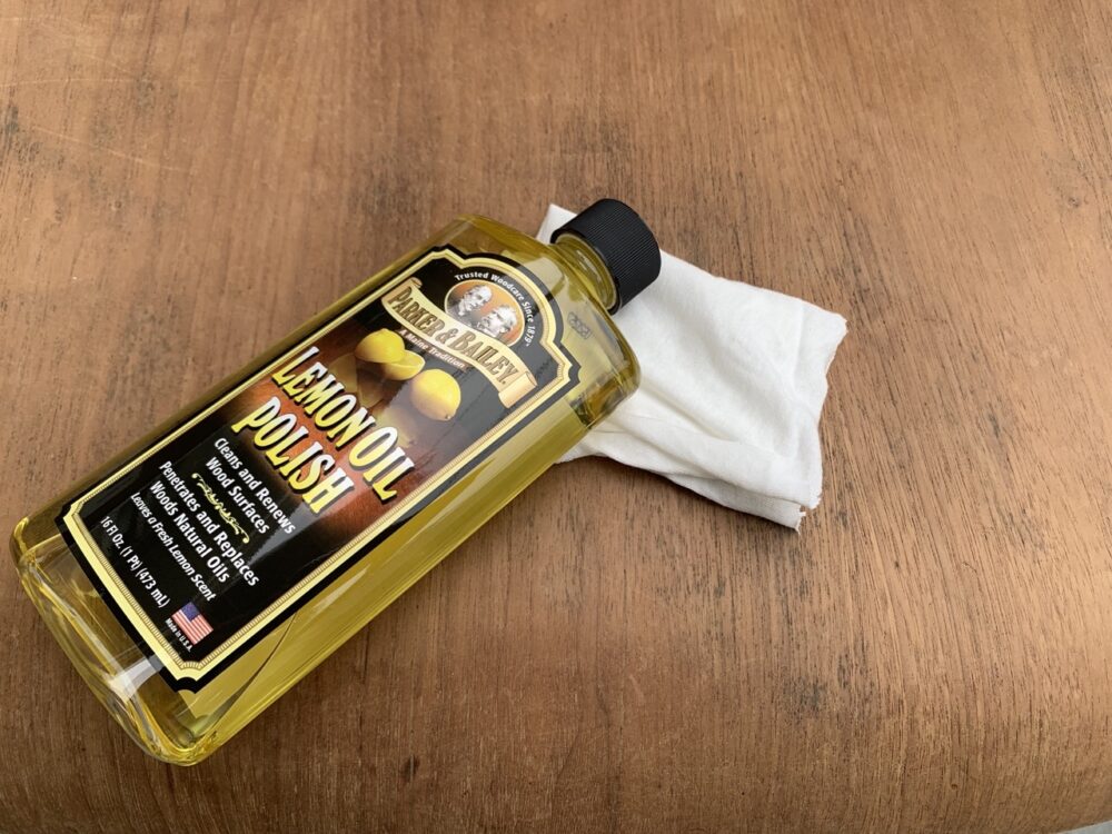 レモンオイルは、写真の通りパッケージに入っている状態で見ると黄色いが、ウエスにとった段階ではほとんど色はない。円を描くように塗り広げ、1度目の塗布後の状態。オイルが木に染み込んでいくことで生まれた自然な色という感じで、この段階では光沢は皆無。乾燥を待つ間に、座面以外も少し塗ってみたところ、驚くほど簡単に小傷が目立たなくなる! 以下のbefore→afterの通り。