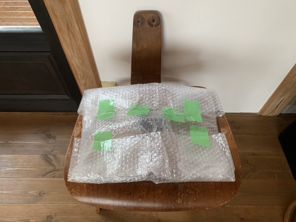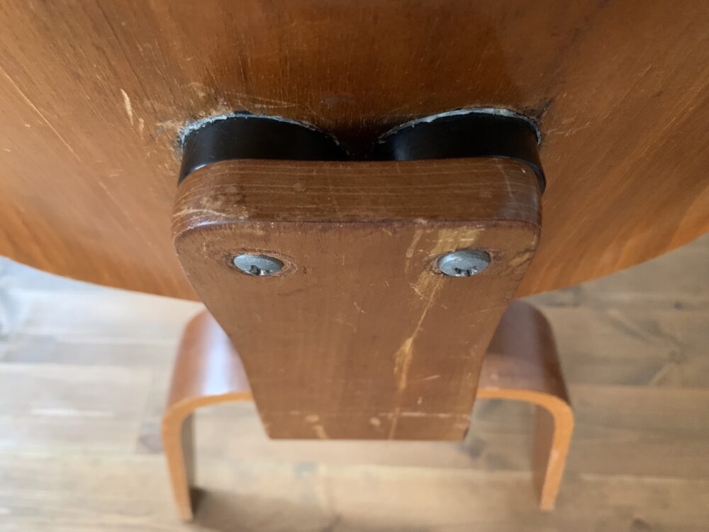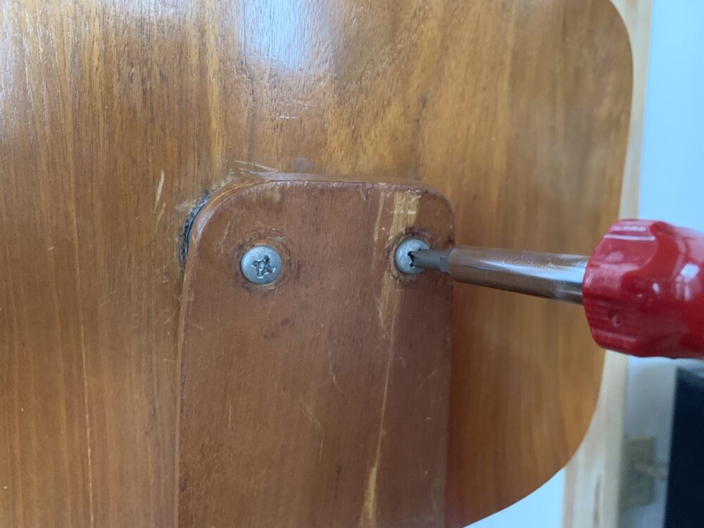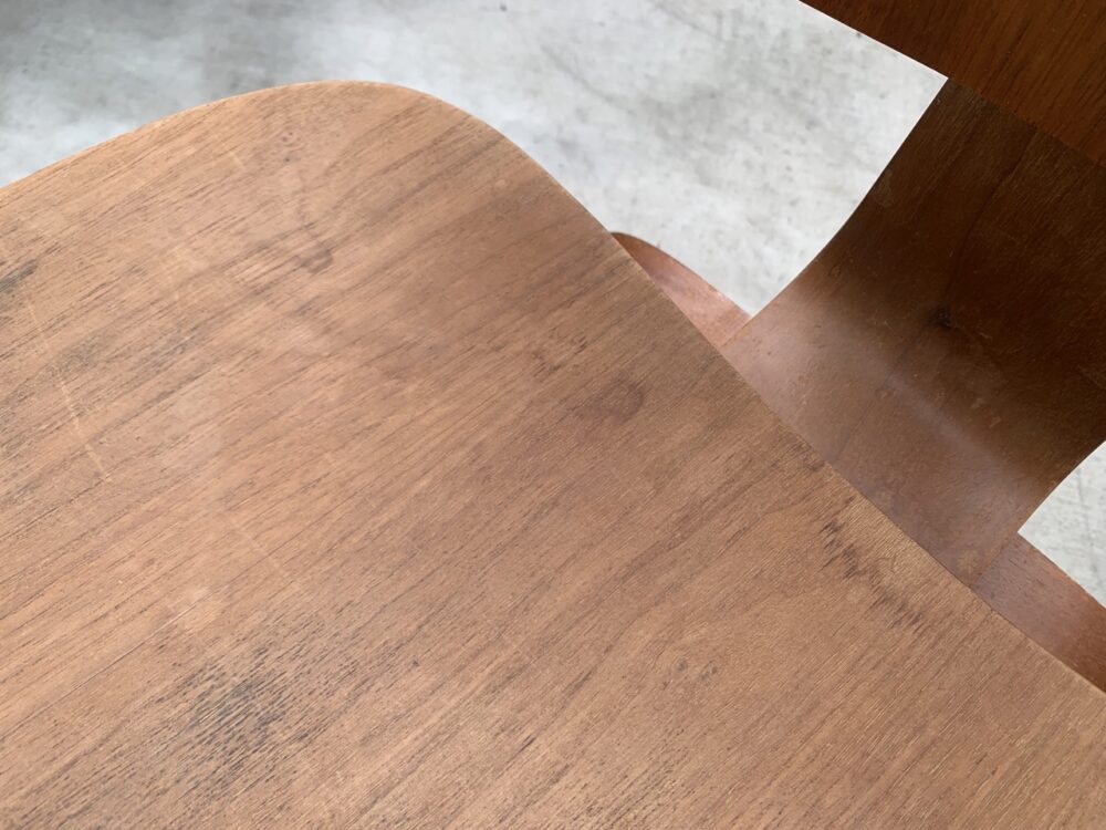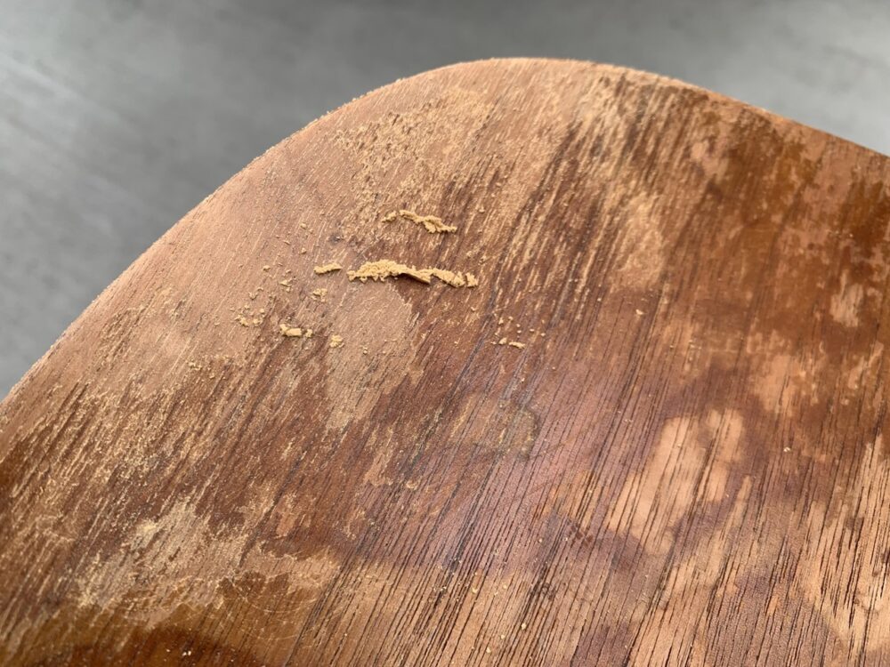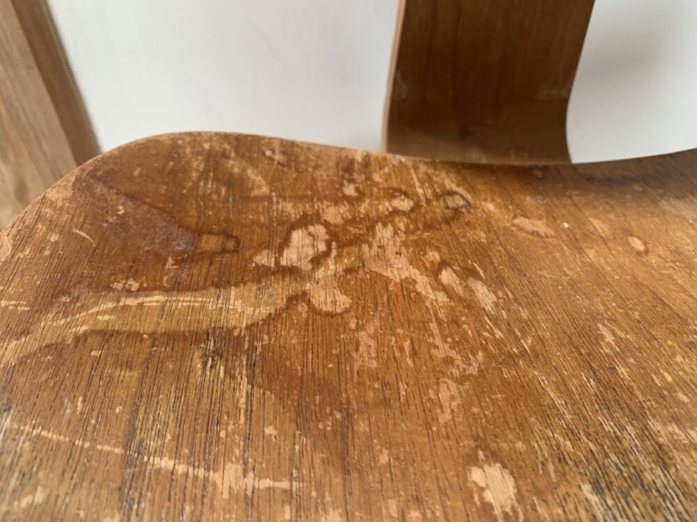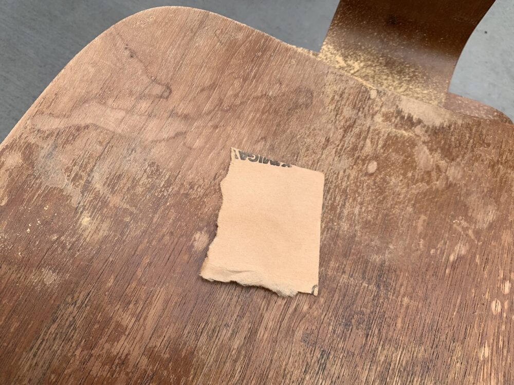 しかし、せっかくチェアとしての座れる機能を取り戻したのに、コンディションは写真の通り。水染みや塗装の剥げが散見し、ある意味ビンテージらしい風貌ではあるが、せっかくなら綺麗にしてあげたいと思い立った。そこで前述のentranceに自分でリペアしたい旨を連絡したのだが、その際に伝えたのが紙やすりなどで塗装を取り除き、ウレタンニスなどを塗るという計画。すると、ウレタンニスよりもBRIWAXやレモンオイルなどの方がうまくいくかもしれないとの返答をいただいた。