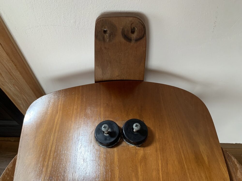 およそ1週間以内に作業完了の連絡、発送の連絡があり(繁忙期はその限りでない)、丁寧な梱包とともに到着したのがこれ。私が送ったマウントがオリジナルサイズではなく、マウントサイズが背もたれ側に掘られている丸い溝に対して直径3〜4mm程度小さいため、接着自体は問題ないもののマウントと溝に数ミリの遊びがあるとのこと。溝とマウント周りの隙間がオリジナルよりも広くなっているため、通常の修理よりも接着剤が目立っているとの報告を受けたが、気になるほどでもなく、ネジ穴の位置も問題なし! 3カ月間の保証も付くということで、安心。entranceさん、ありがとうございます!