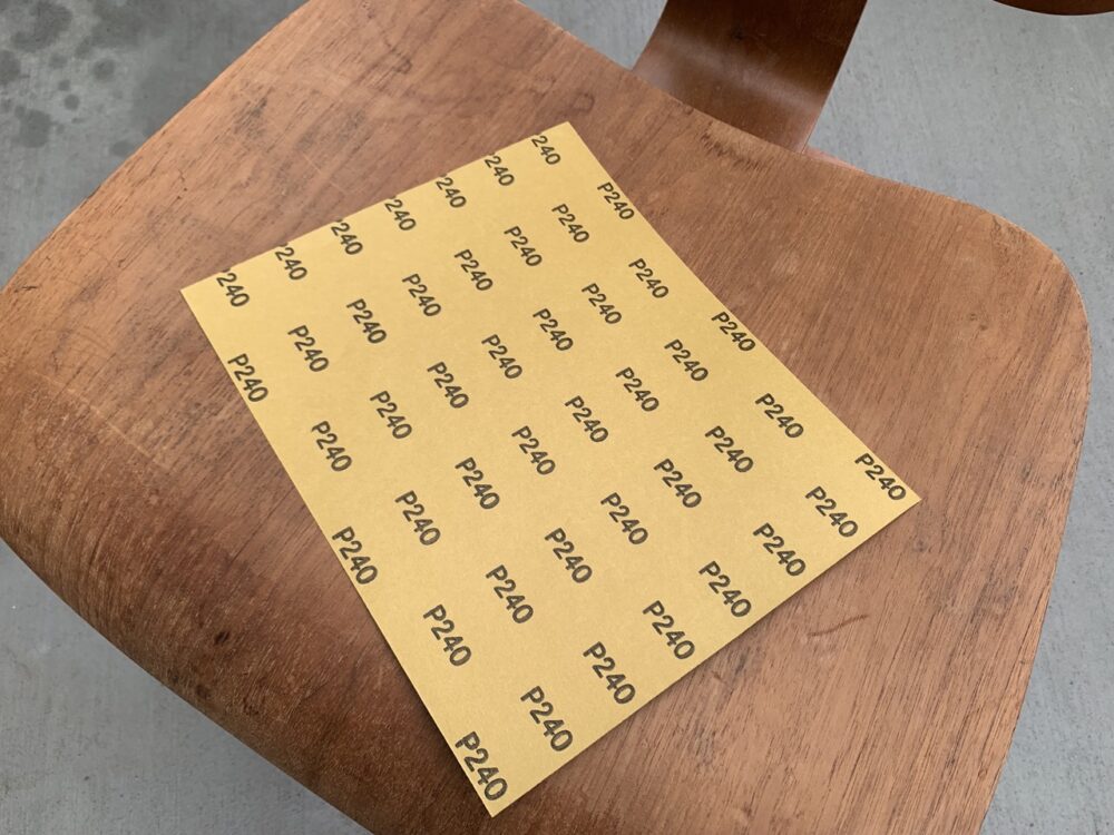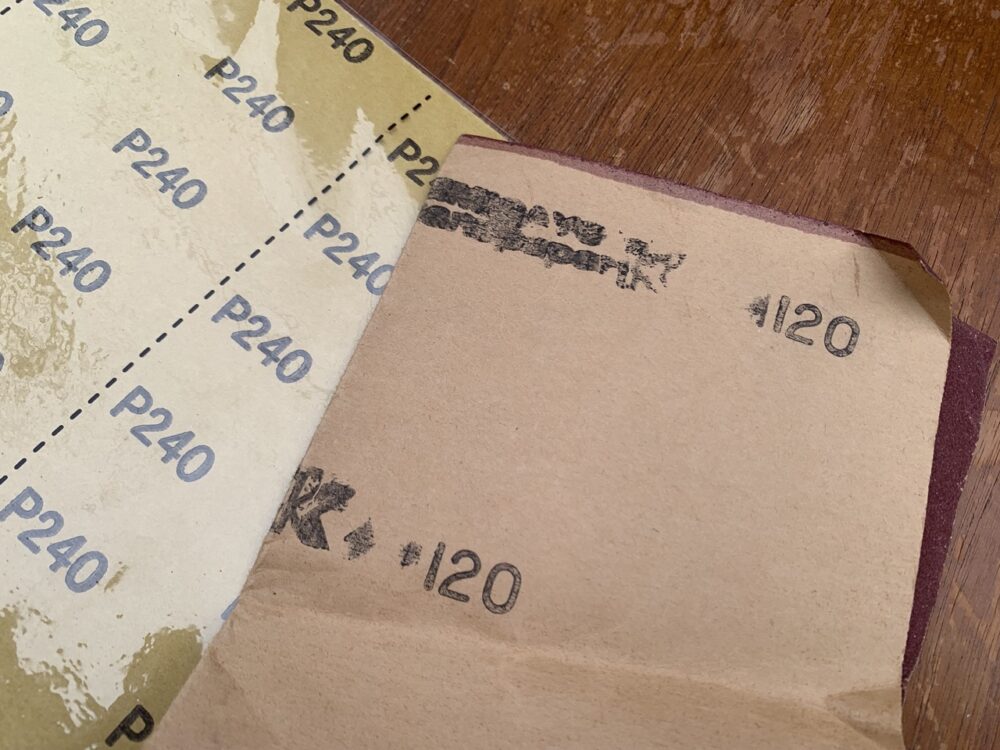 作業そのものは至ってシンプル。サンディング(やすりがけ)した後に、オイルを塗り重ねるだけ。まずはサンディング用の120番と240番の紙やすりを用意する。紙やすりは数字が少ないほど目が粗く、数字が大きいほど細かい。まずは塗装を剥がすために120番を使う。