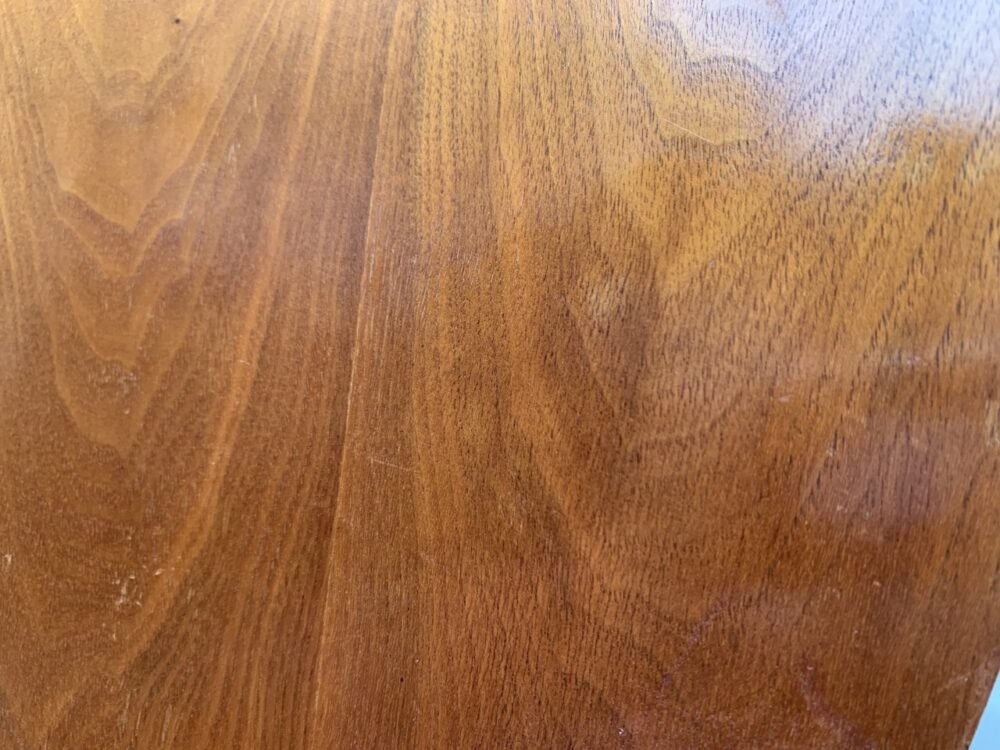 まずは端の方でテスト。結構簡単に塗装が剥がれる。よし一気に行こう。この段階では特に木目を意識せずに、円を描くようにしながらサンディング。塗装や汚れが剥がしながらもムラが出ないことを意識した。およそ15分ほどかけて120番を使用し、塗装を完全に除去した。その証拠がこの写真の通り、全く光沢感のない状態。同時に水染みなどもある程度までは取り除くことができた。