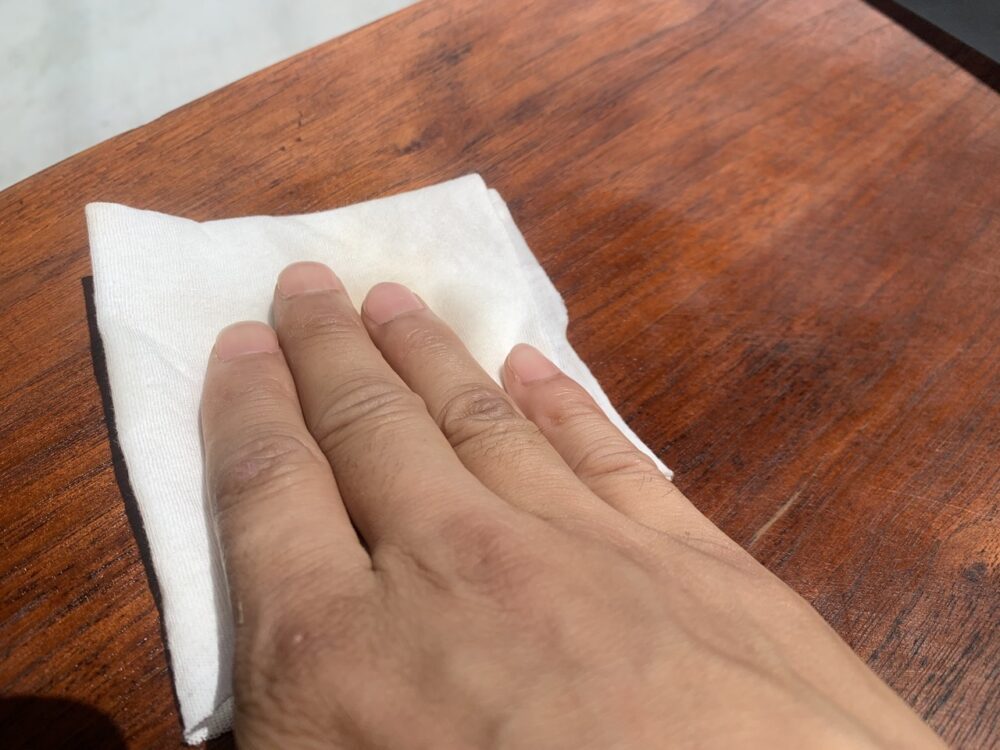 で、ここからがレモンオイルの出番。コットンウエスに適量(私の場合は五百円玉程度)をとり、ウエスに馴染ませてから塗布。靴磨きなどでも同様のことが言えるが、ニスやクリームなどの類いはウエスに馴染ませてから塗布しないとムラが出てしまうことがあるので、ご注意を。もちろん、ウエスは廃棄前のTシャツなどでももちろんオッケー。オイルは思った以上に伸びが良く、薄く塗り広げることができるタイプなので、厚塗りなどの心配はなし。そして、いわゆるワックスやニスとは異なり、ほとんどベタつかない。そして、うっすらとレモンの匂いが香ってくるのもかなり嬉しい。オイルやニスの匂いも嫌いではないが、良い匂いなので塗り重ねるのも苦じゃない。