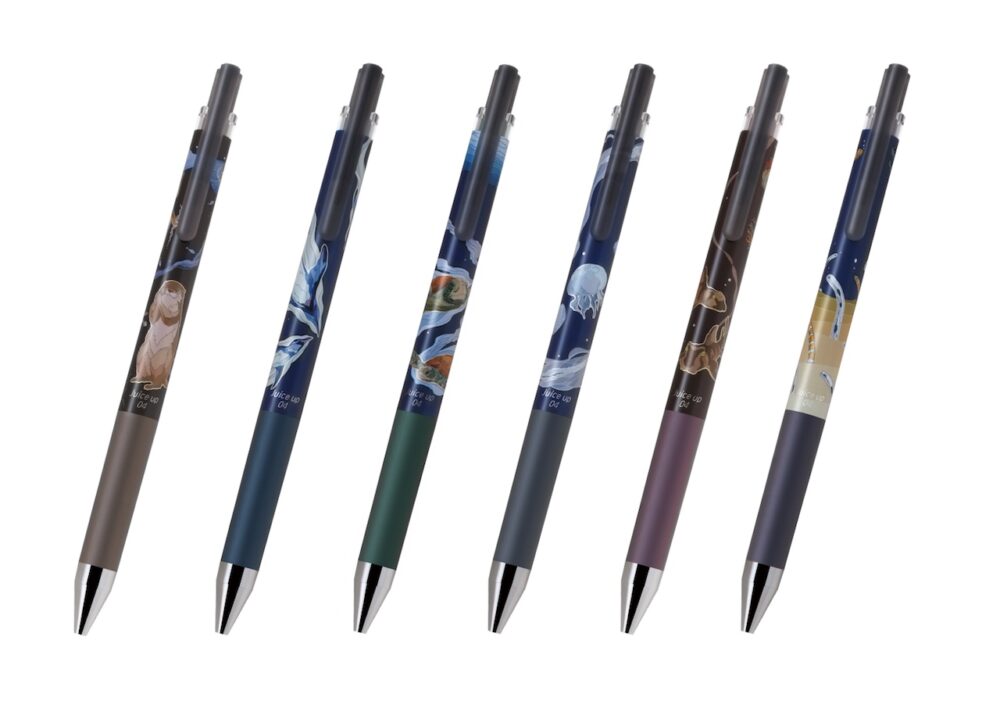 さりげない光沢感を持ちながらも落ち着いた色合いの6色のインキ色に合わせ、水族館で人気の生き物たち6種類をラインアップ。生き物の輪郭を金や銀のメタリックカラーで縁取りし、鮮やかな転写印刷で軸上部全体に鮮やかな海の生き物のデザインを施した。