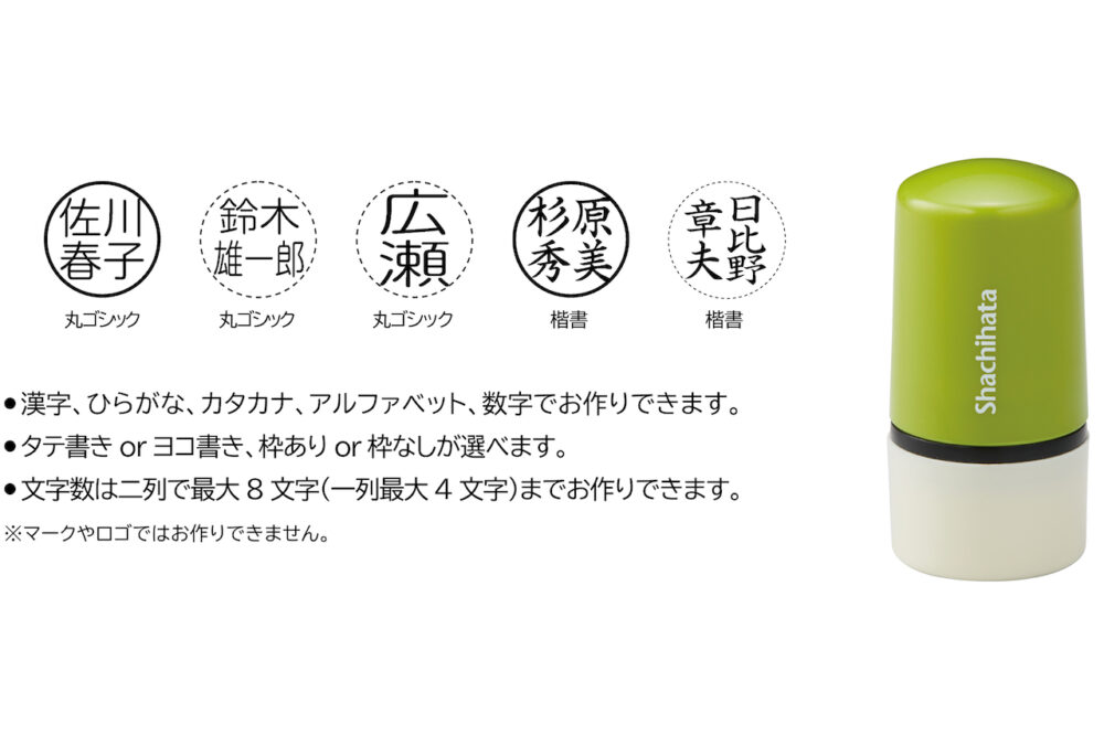印面サイズは、直径13mm。漢字、ひらがな、カタカナ、アルファベット、数字で作ることができる。印面は、商品購入後にインターネット・専用ハガキで申し込みできるメールオーダー式だ。