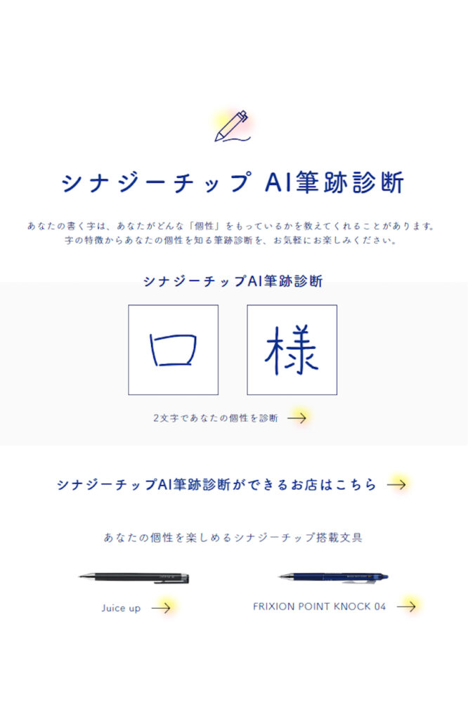8月1日から12月末までの期間、Web上に特設サイトを開設し、「AI筆跡診断」を活用した「シナジーチップAI筆跡診断」を実施。シナジーチップ採用の筆記具で白い紙に「口」と「様」の2つの文字を書いて、サイトからスマートフォンのカメラで読み込むと、筆跡の特徴から書き手の性格を診断。