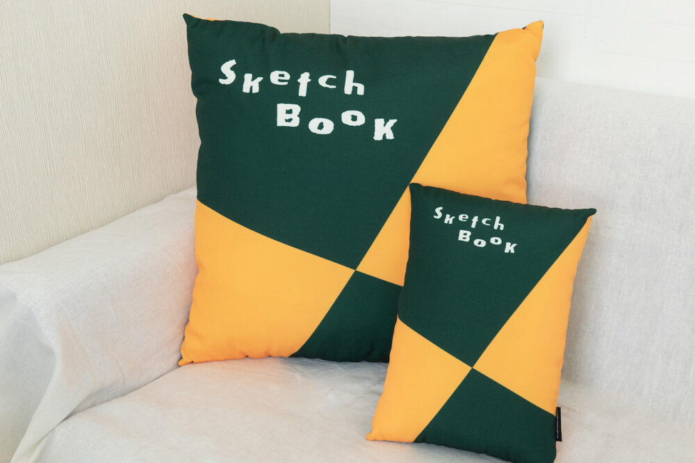 「図案スケッチブック」がクッションに大変身。丈夫な織生地に中綿がたっぷり入っていて、抱き心地抜群。インテリアとして飾ってもかわいい存在感のあるアイテム。