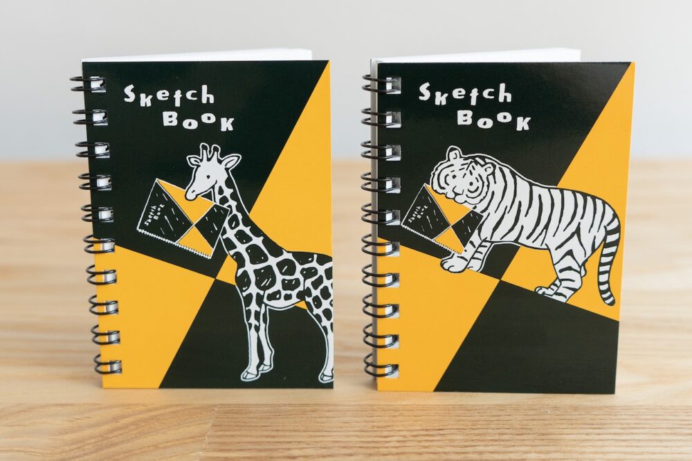 「図案スケッチブック」柄の表紙の画用紙カレンダー。各ページにはそれぞれ動物モチーフのイラストが描かれており、1年を通して異なる表情を楽しめる。スタンドが付いているので、卓上カレンダーとしても使用できます。カレンダーの後半 は無地のページがあり、やりたいことや目標、思い出など好きなように描くこともできる。